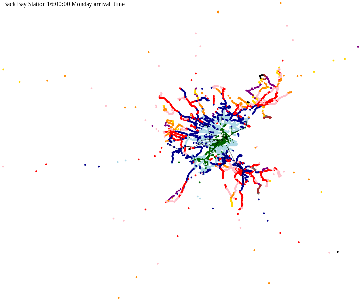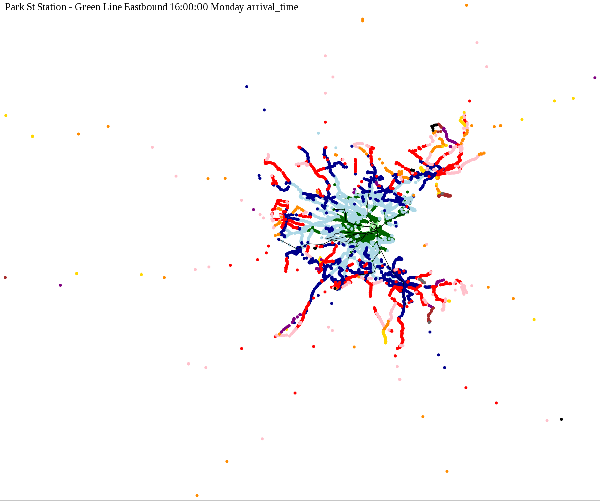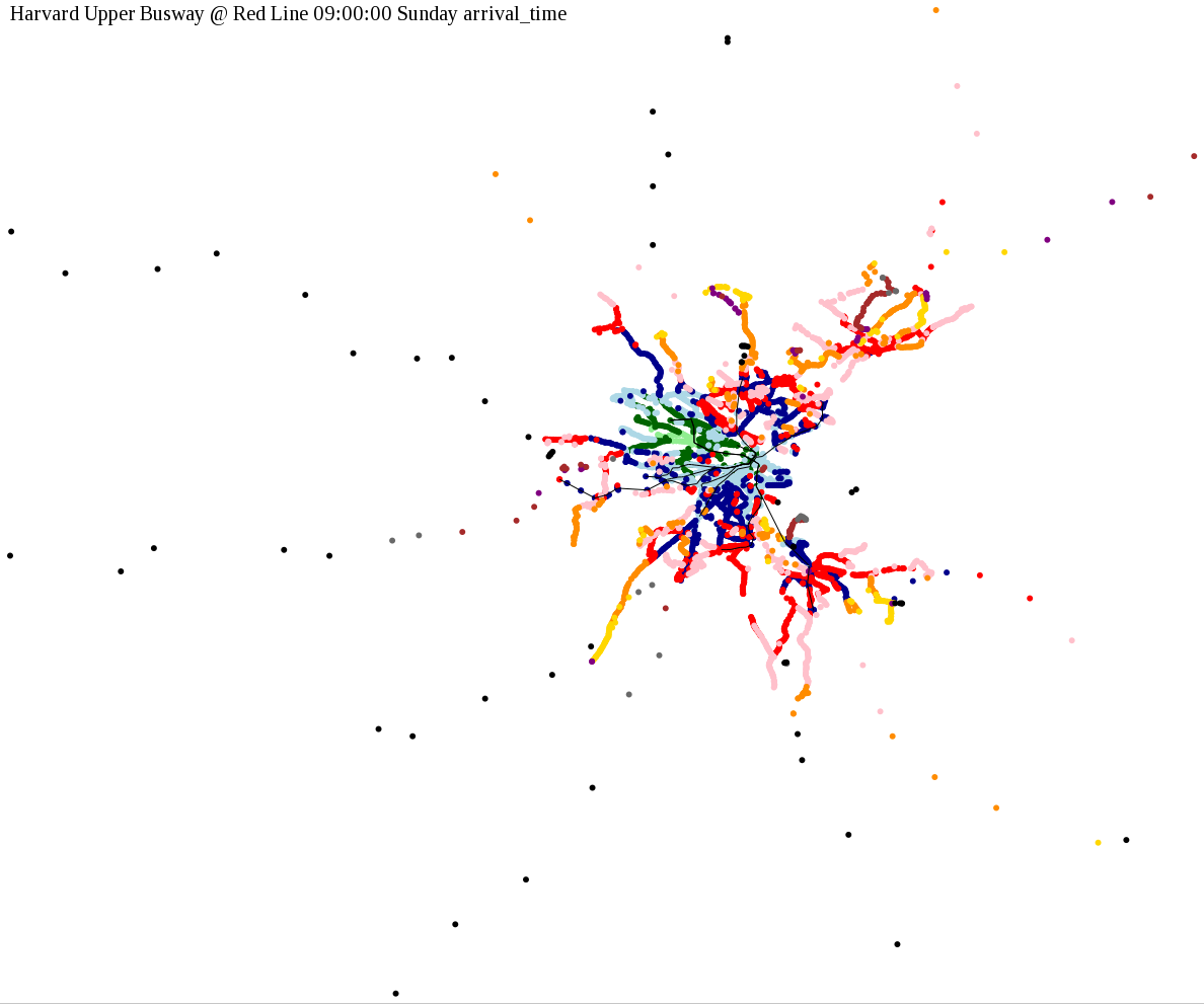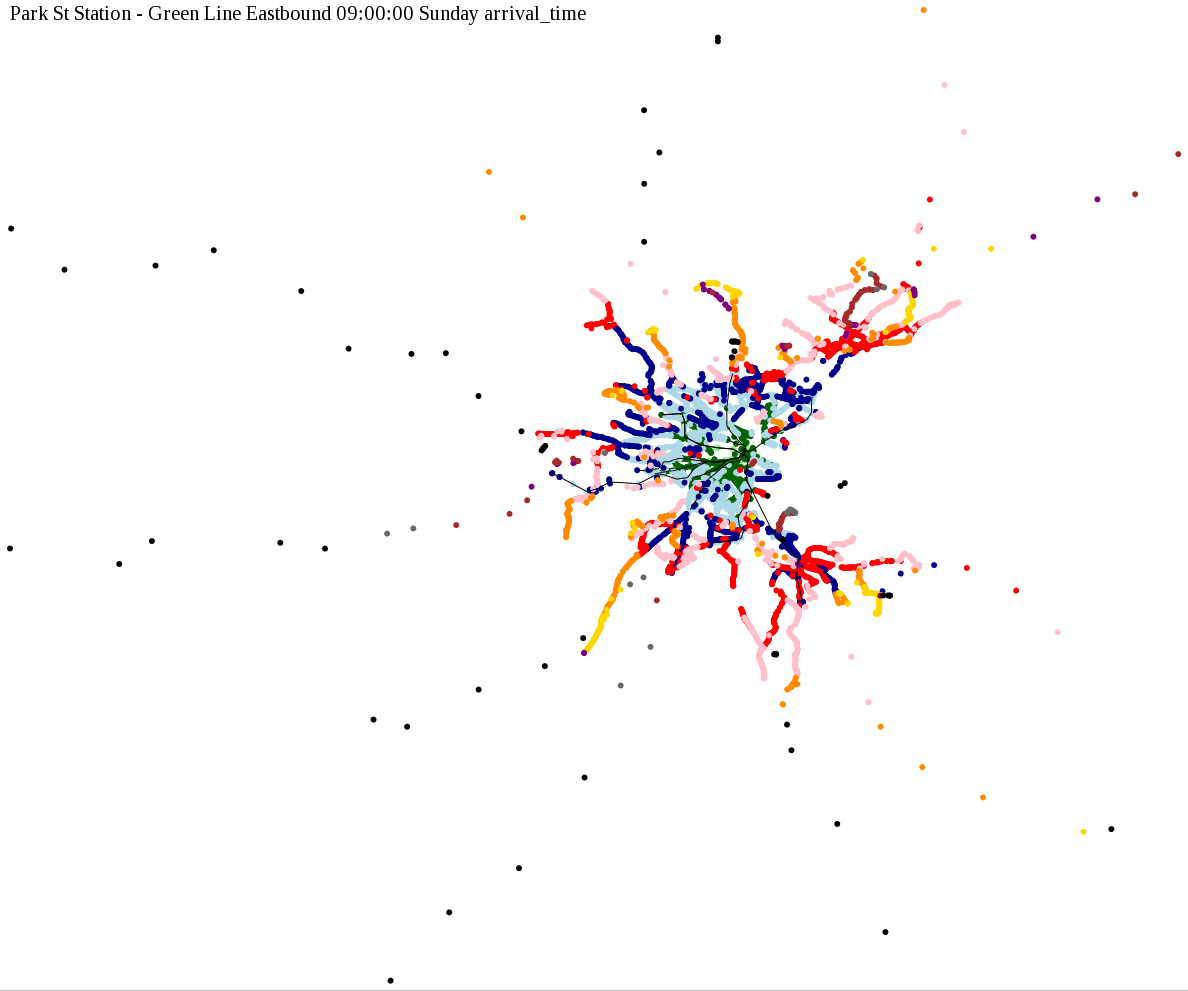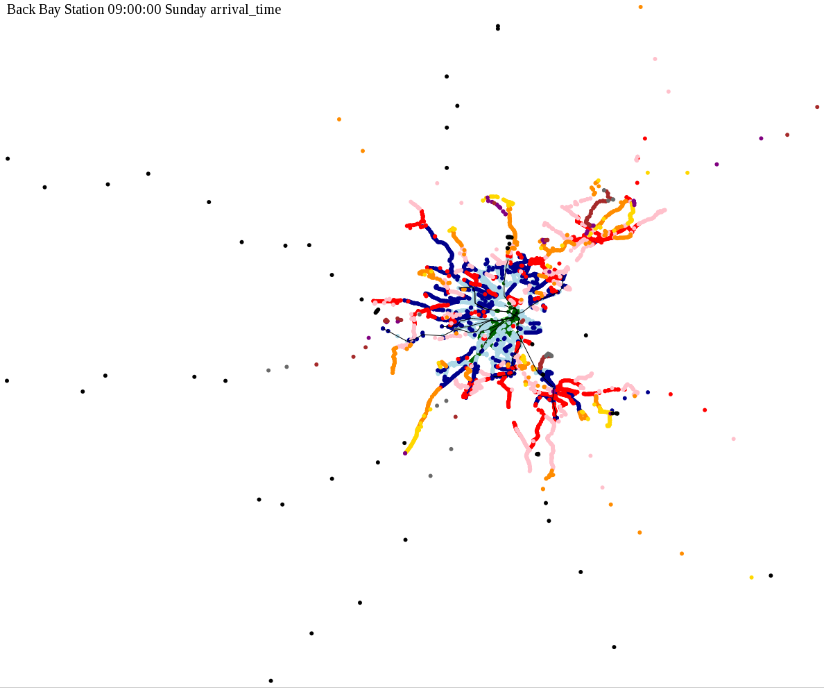 I chose a few stops out of personal curiosity to do my first few simulatations. I decided 9am Monday was a good time because it was relatively busy, and 9am Sunday was a time when relatively few services would be running. After that, I chose a set of core regional employment centers based on a MAPC Job Density map and ridership by station. In particular, the composite maps at the bottom show results averaged over my list of employment centers, approximating general connectivity to regional points of interest.