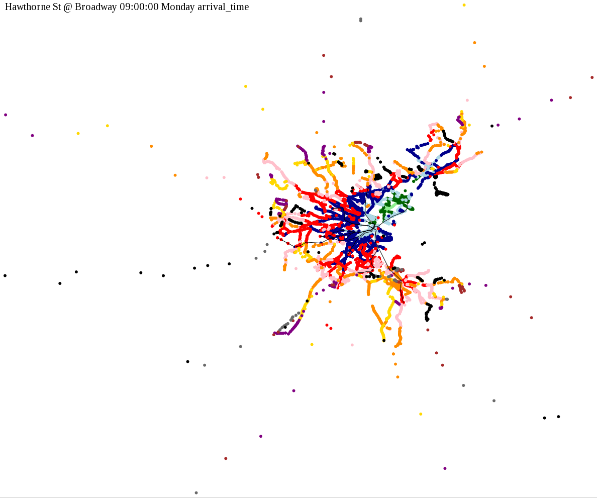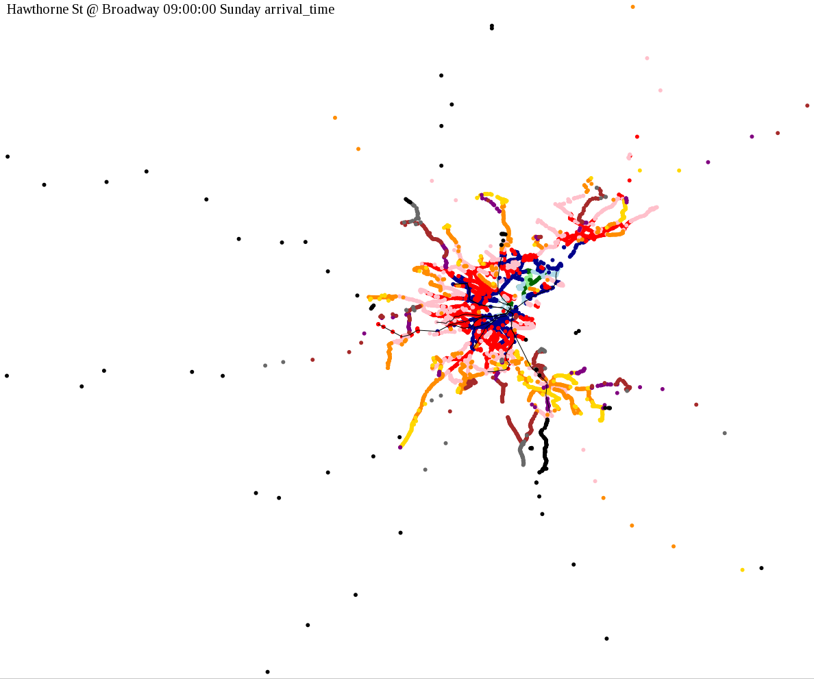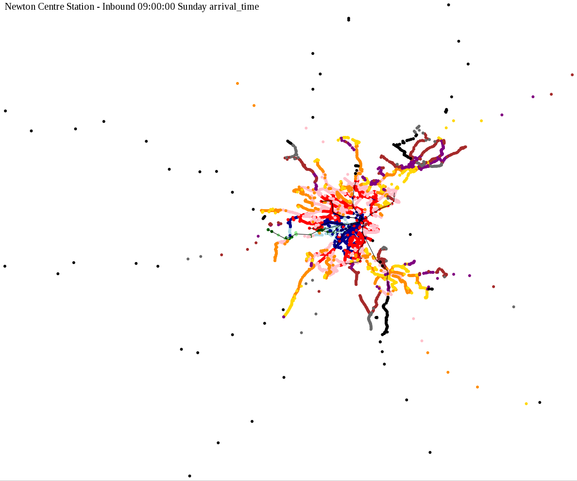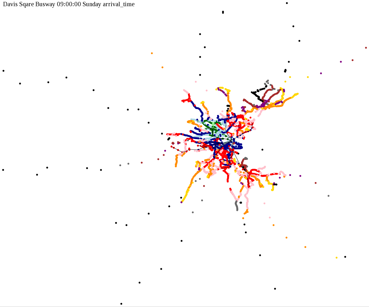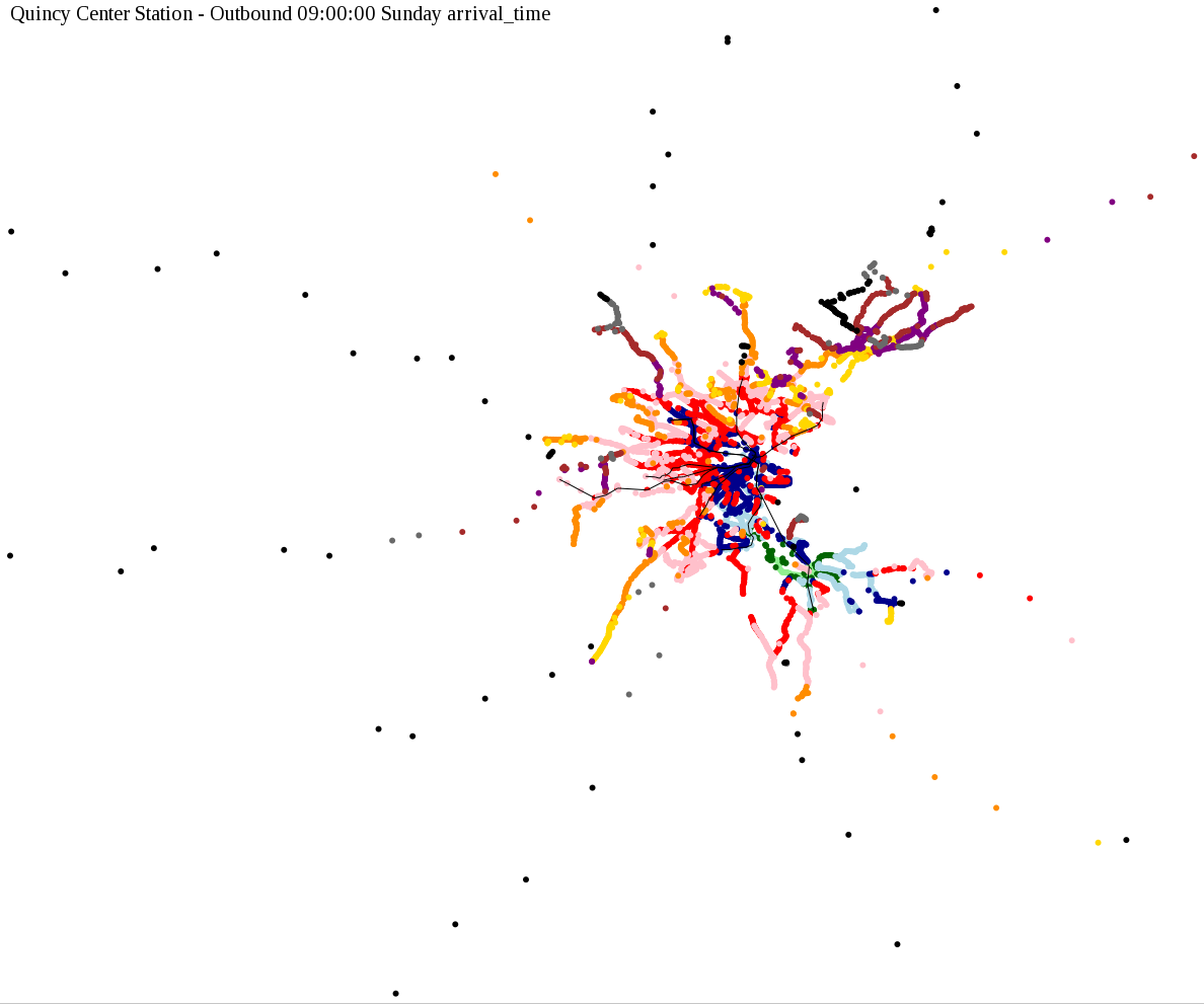 I chose a few stops out of personal curiosity to do my first few simulatations. I decided 9am Monday was a good time because it was relatively busy, and 9am Sunday was a time when relatively few services would be running. After that, I chose a set of core regional employment centers based on a MAPC Job Density map and ridership by station. In particular, the composite maps at the bottom show results averaged over my list of employment centers, approximating general connectivity to regional points of interest.
