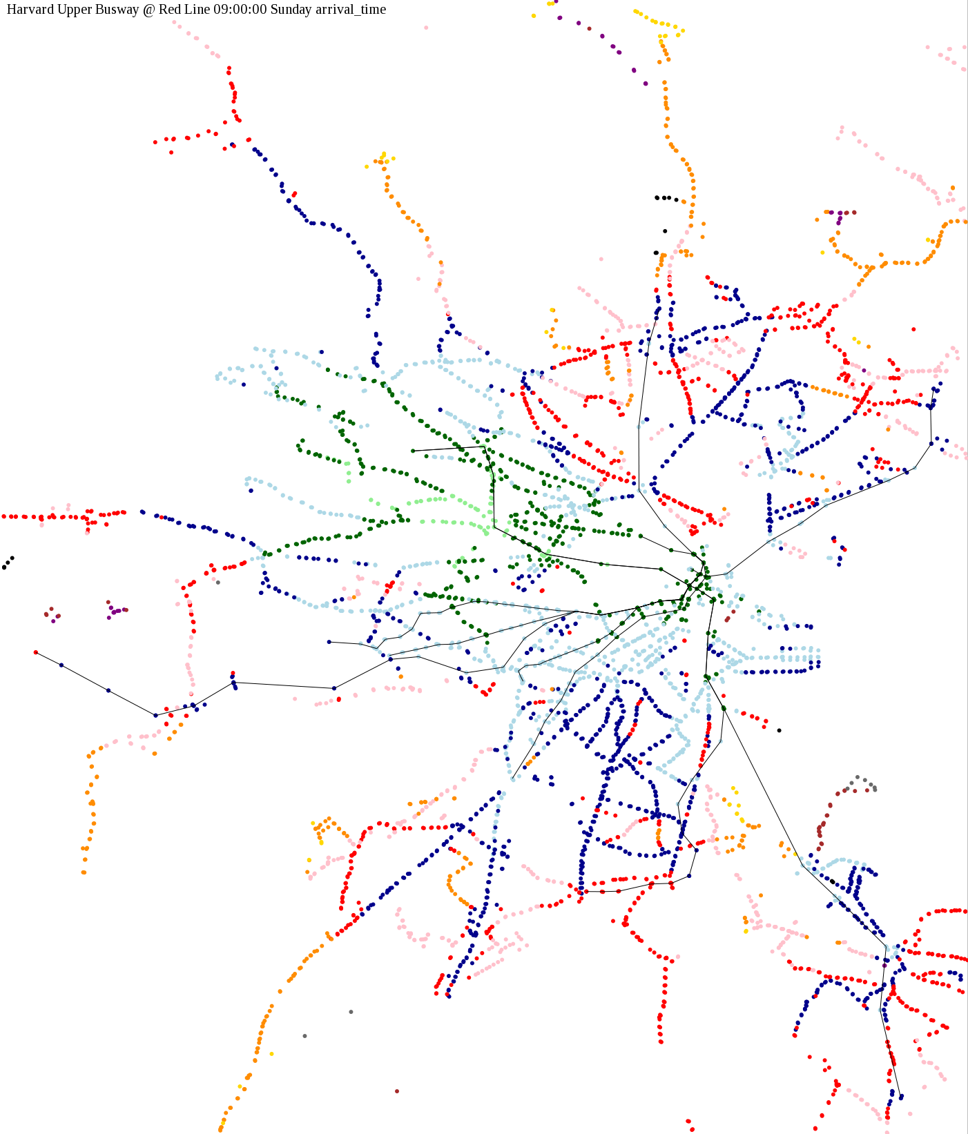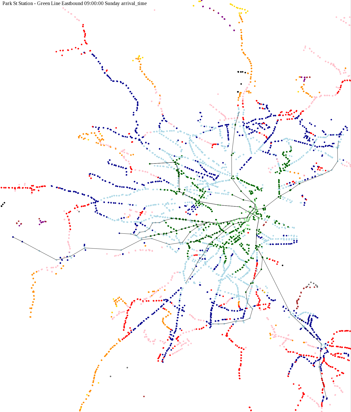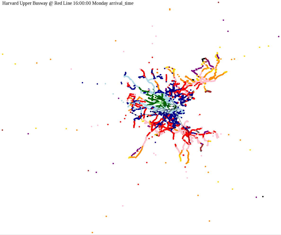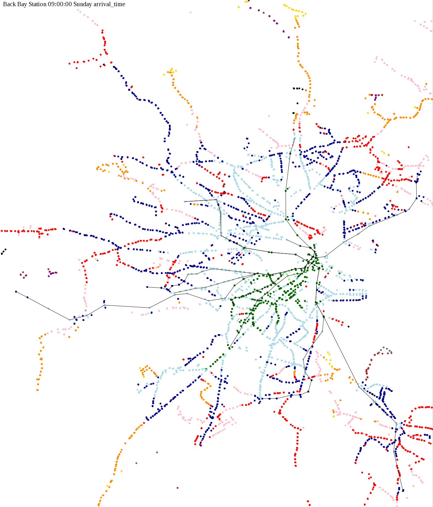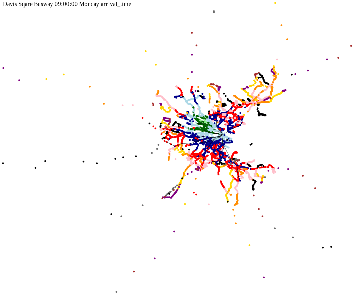 I chose a few stops out of personal curiosity to do my first few simulatations. I decided 9am Monday was a good time because it was relatively busy, and 9am Sunday was a time when relatively few services would be running. After that, I chose a set of core regional employment centers based on a MAPC Job Density map and ridership by station. In particular, the composite maps at the bottom show results averaged over my list of employment centers, approximating general connectivity to regional points of interest.