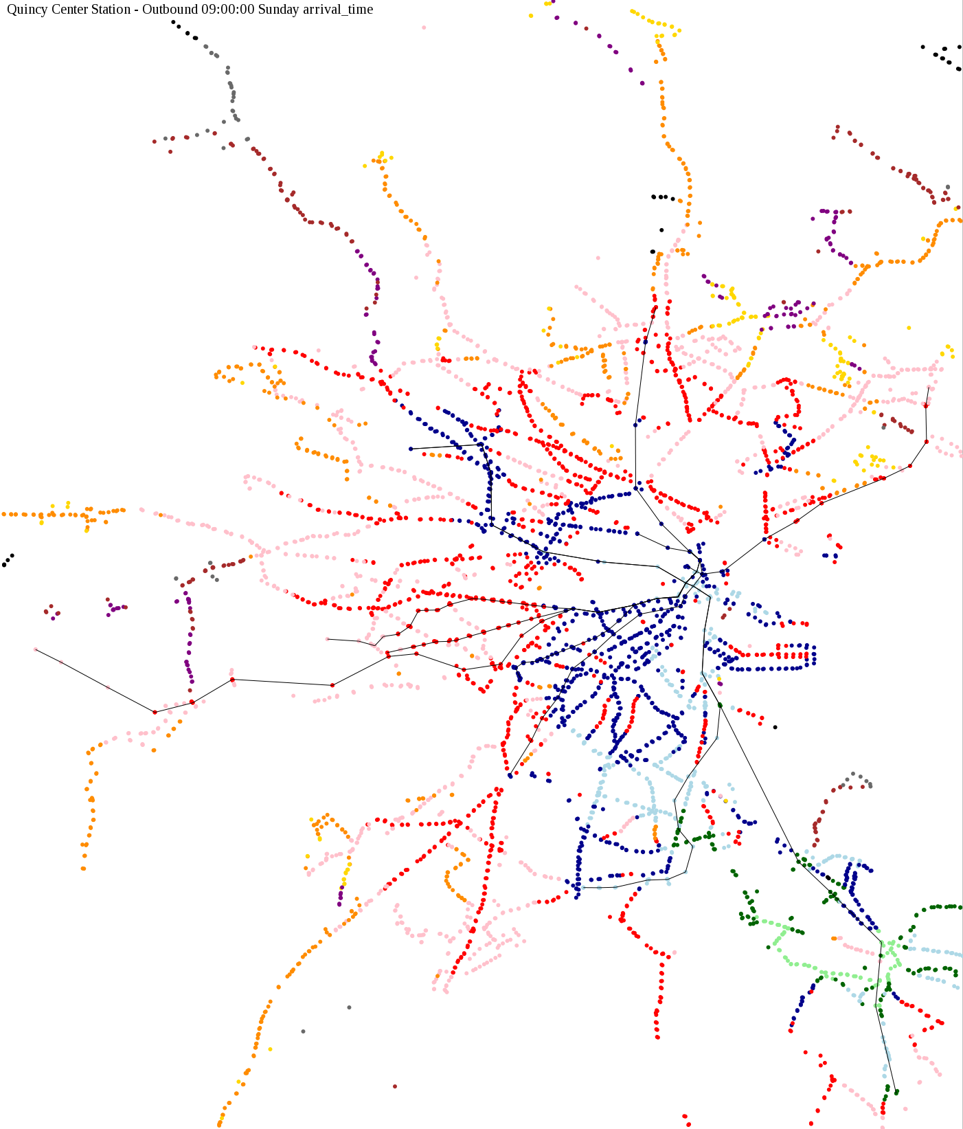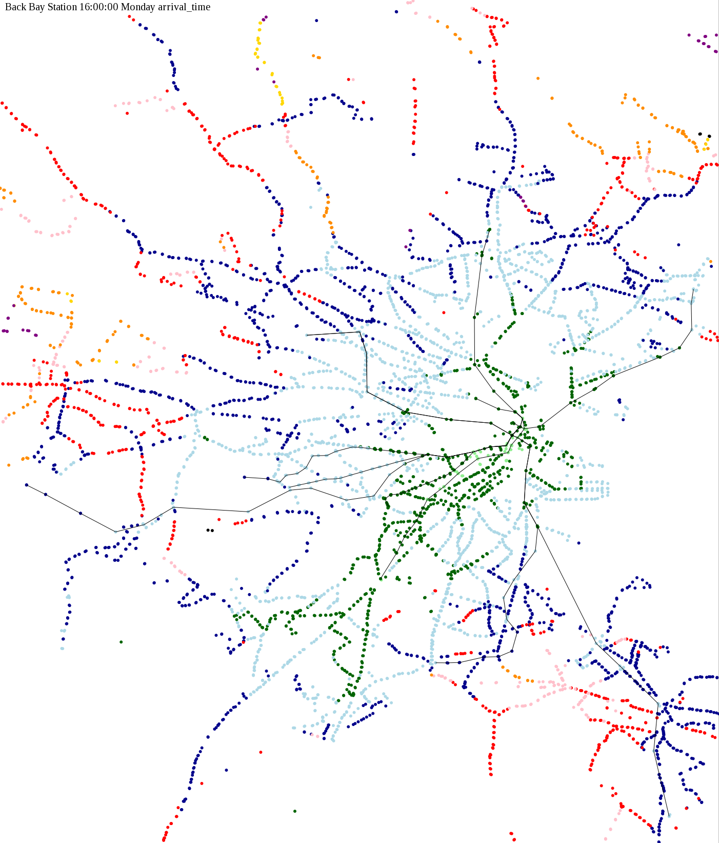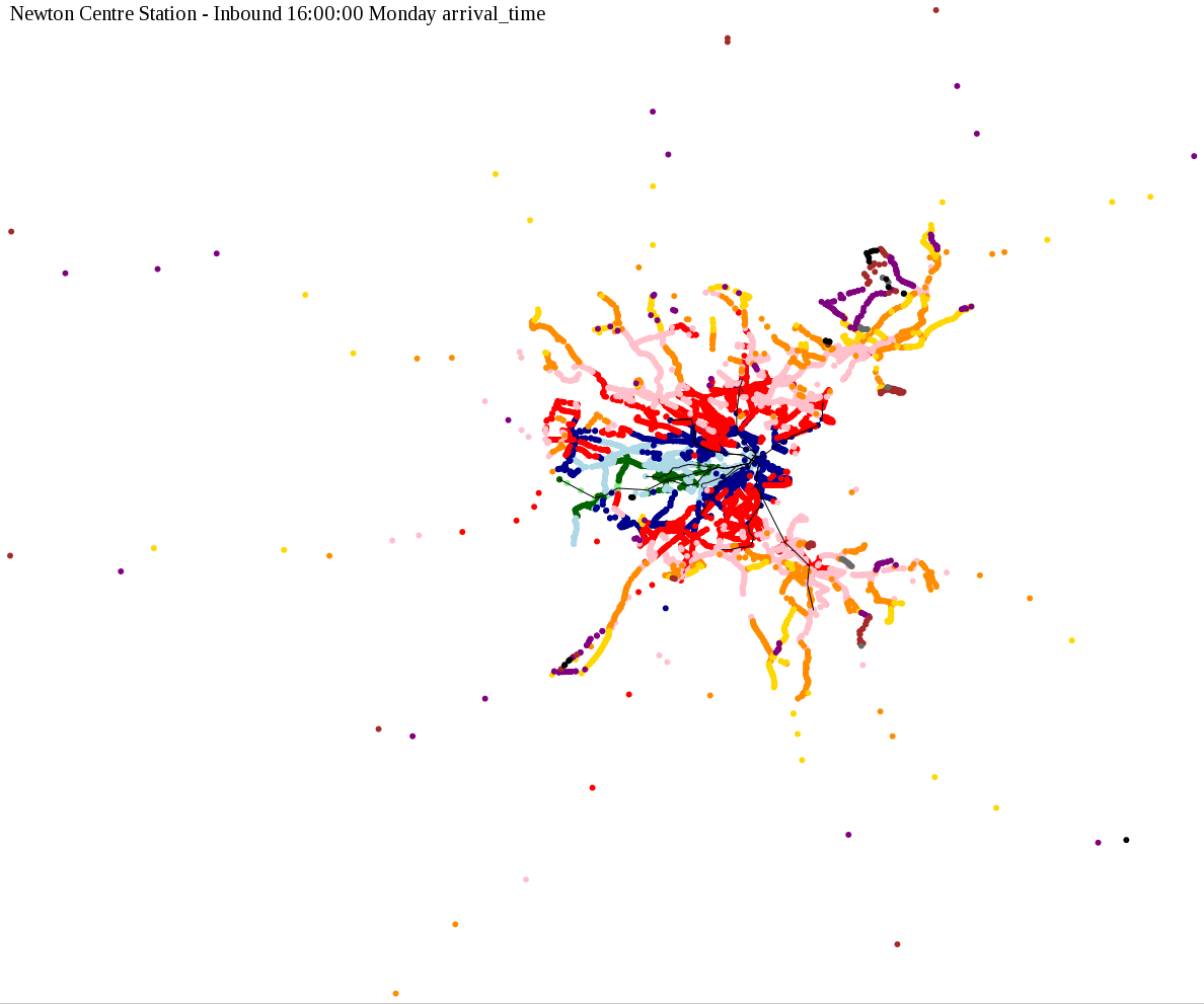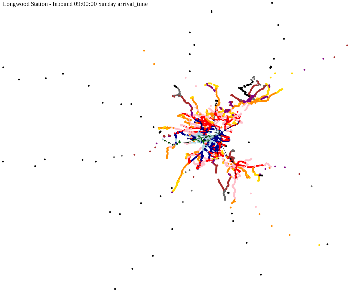 I chose a few stops out of personal curiosity to do my first few simulatations. I decided 9am Monday was a good time because it was relatively busy, and 9am Sunday was a time when relatively few services would be running. After that, I chose a set of core regional employment centers based on a MAPC Job Density map and ridership by station. In particular, the composite maps at the bottom show results averaged over my list of employment centers, approximating general connectivity to regional points of interest.