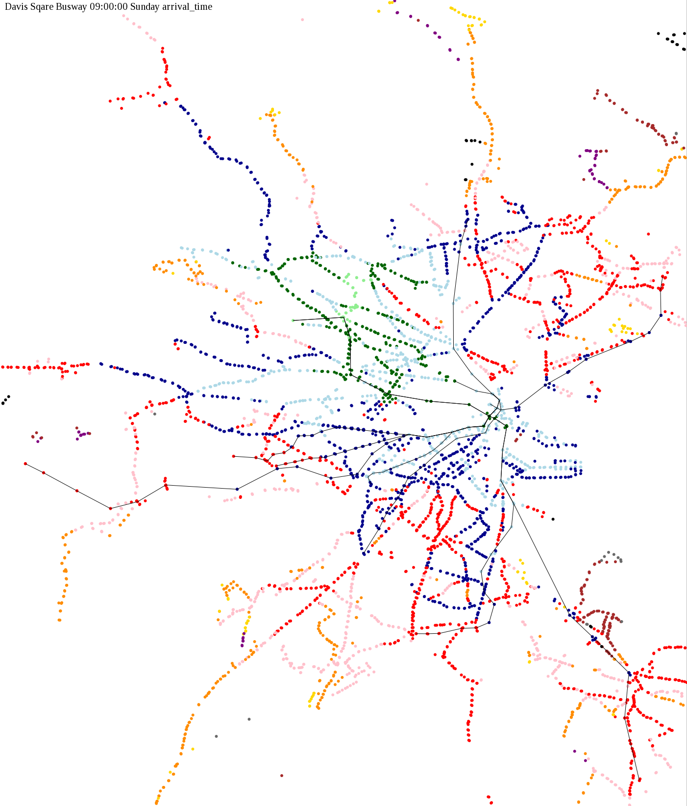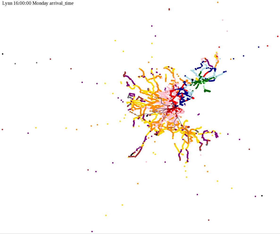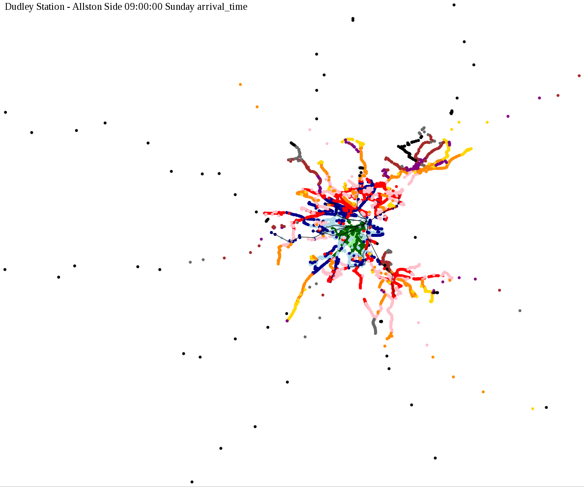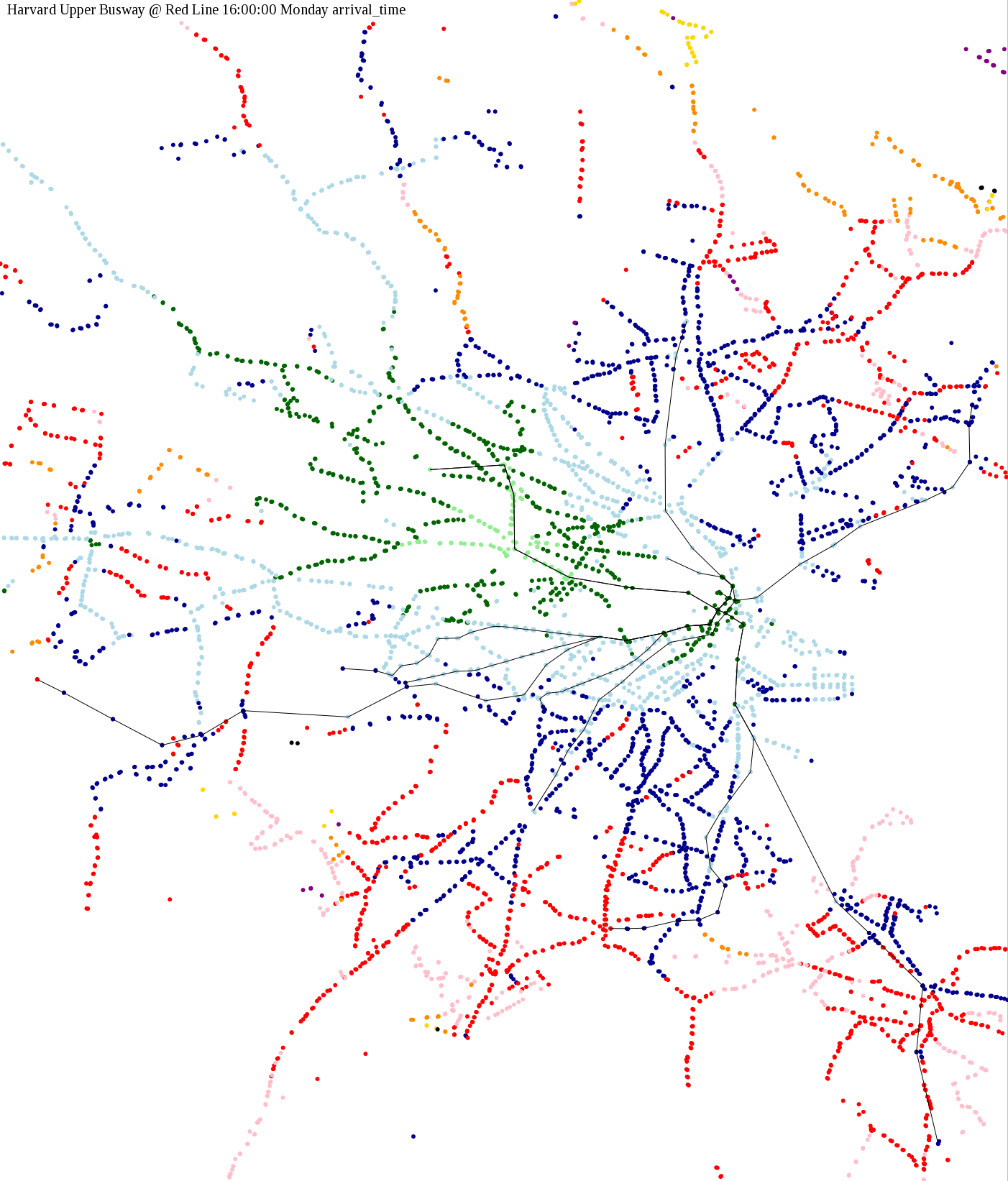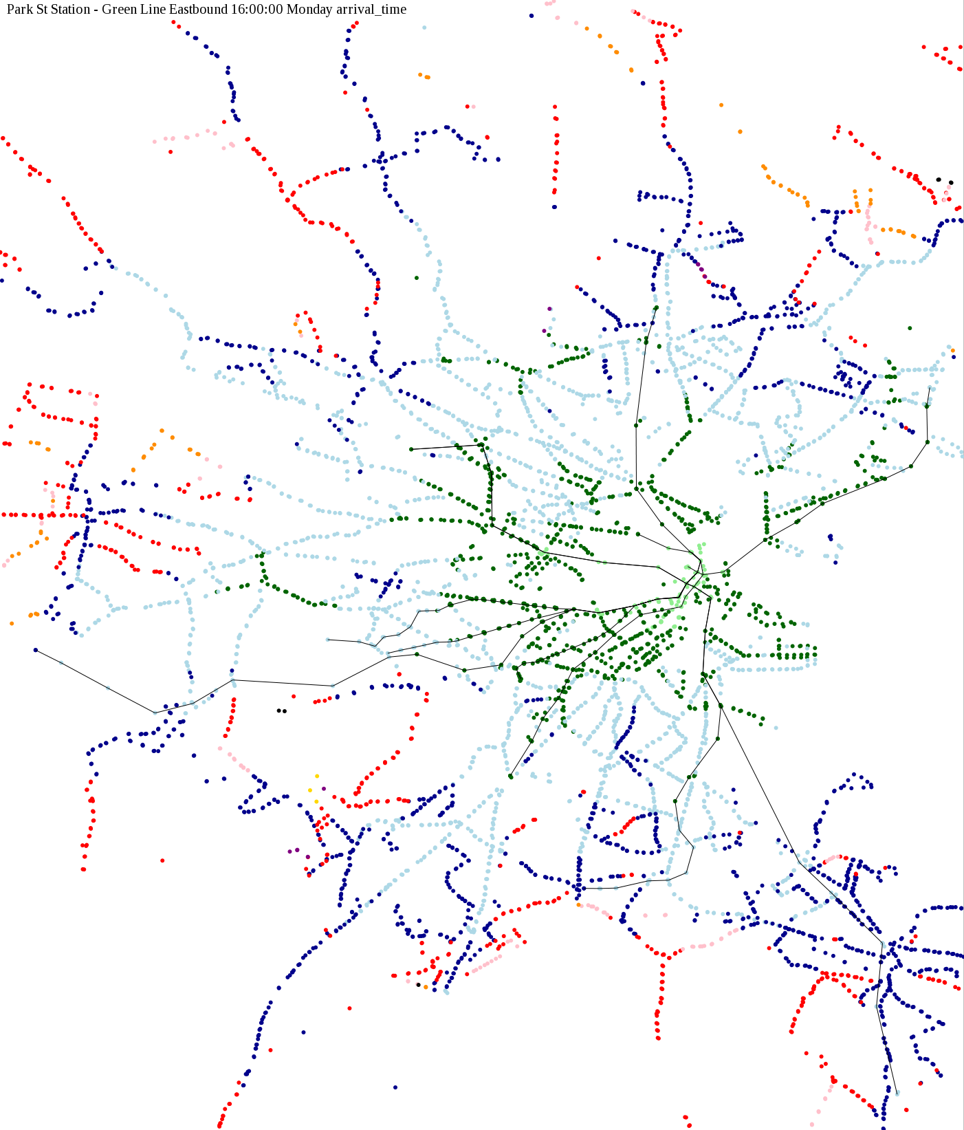 I chose a few stops out of personal curiosity to do my first few simulatations. I decided 9am Monday was a good time because it was relatively busy, and 9am Sunday was a time when relatively few services would be running. After that, I chose a set of core regional employment centers based on a MAPC Job Density map and ridership by station. In particular, the composite maps at the bottom show results averaged over my list of employment centers, approximating general connectivity to regional points of interest.