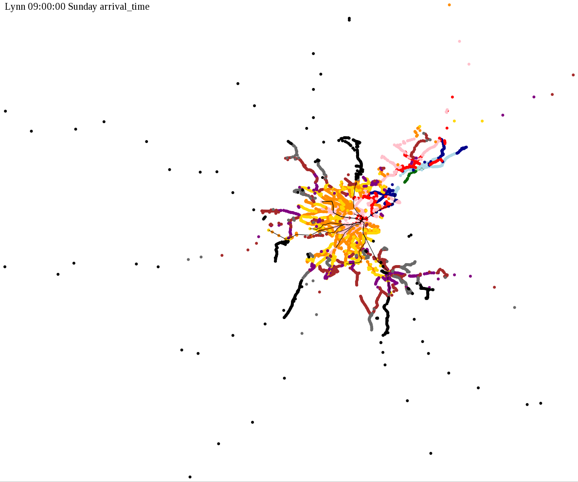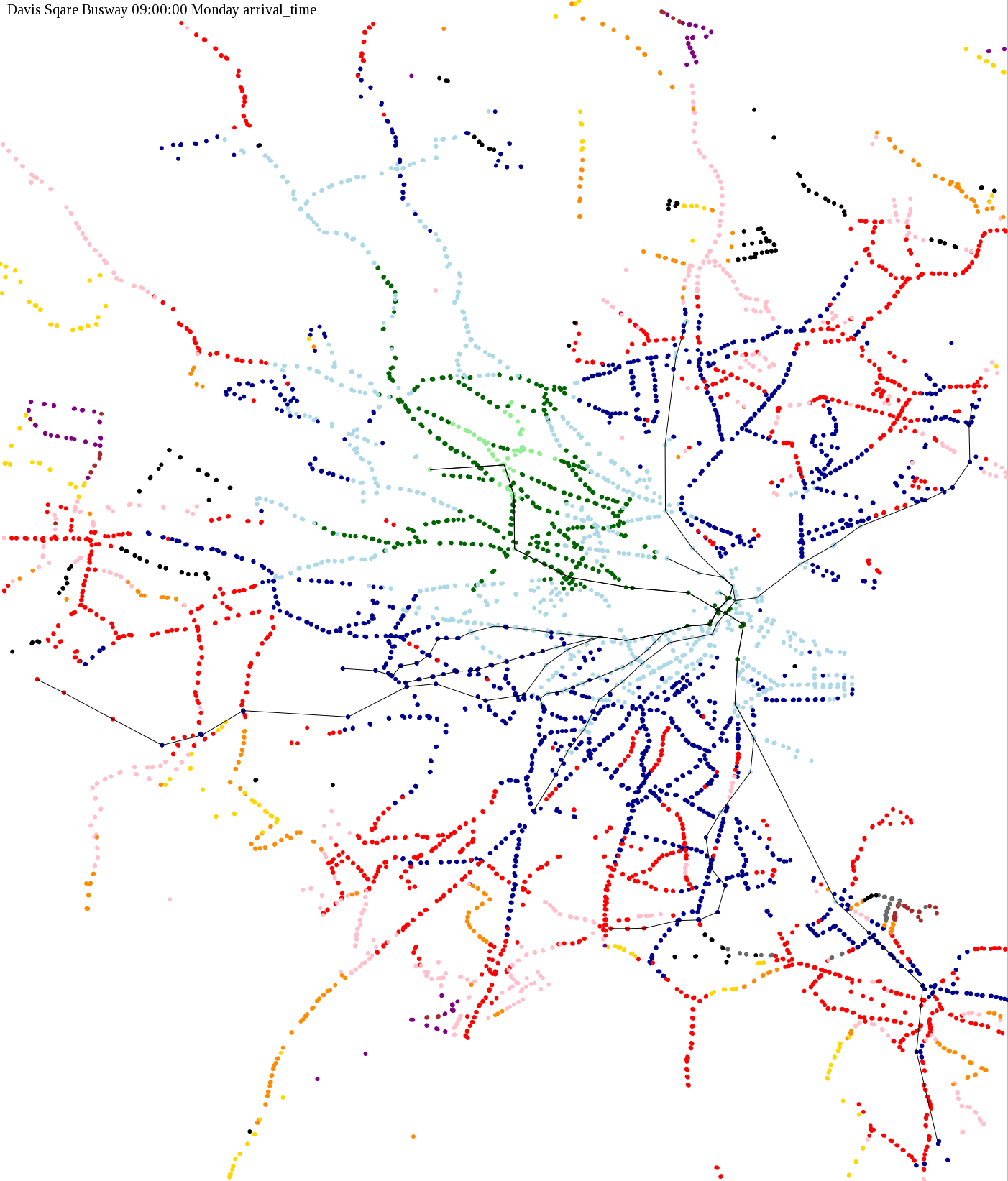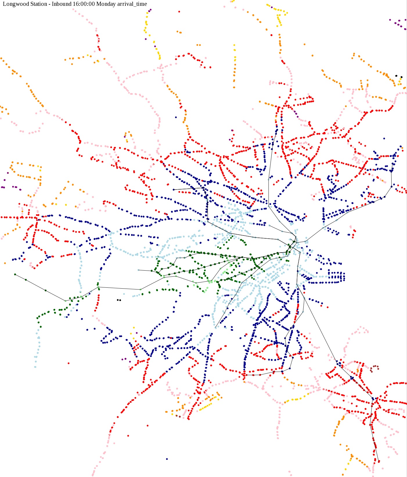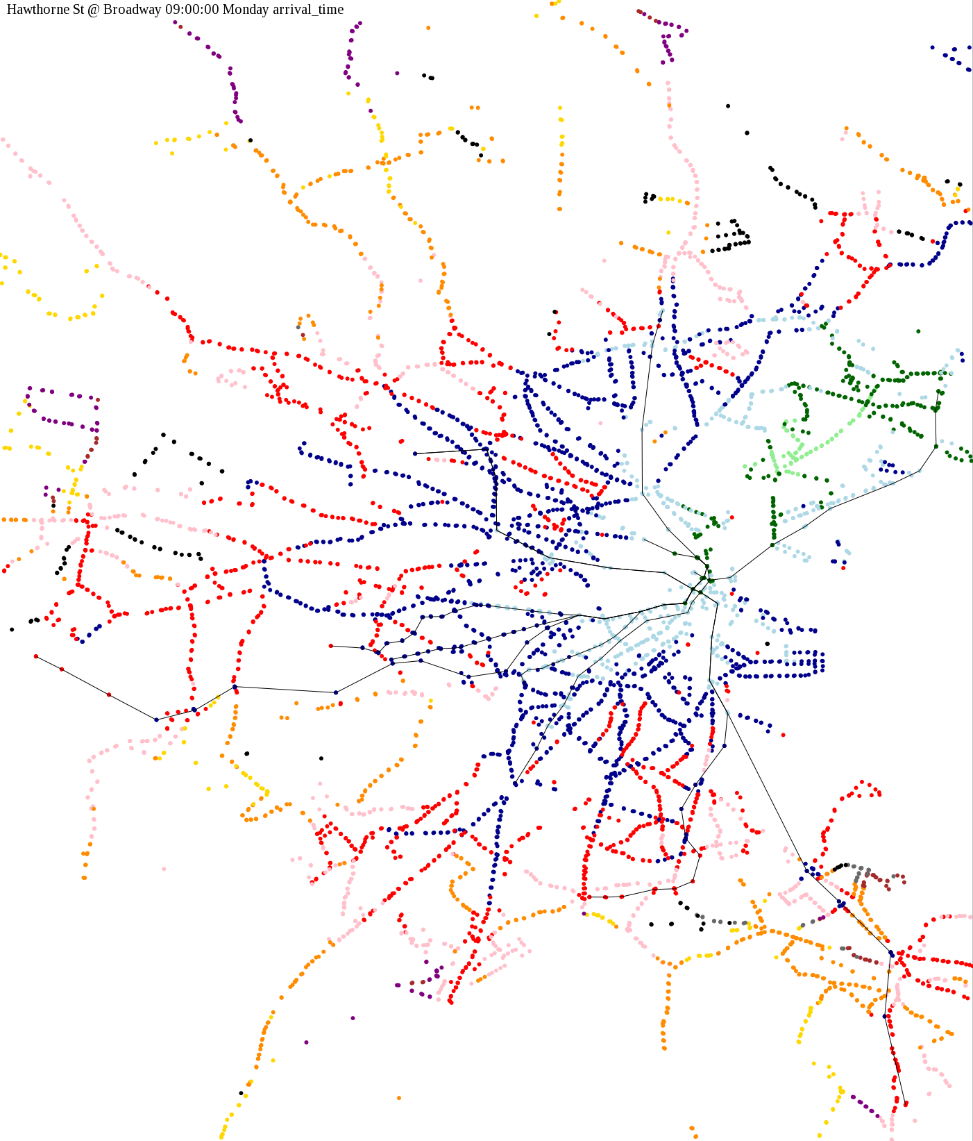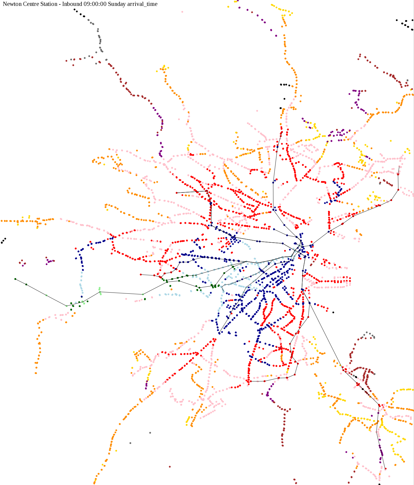 I chose a few stops out of personal curiosity to do my first few simulatations. I decided 9am Monday was a good time because it was relatively busy, and 9am Sunday was a time when relatively few services would be running. After that, I chose a set of core regional employment centers based on a MAPC Job Density map and ridership by station. In particular, the composite maps at the bottom show results averaged over my list of employment centers, approximating general connectivity to regional points of interest.
