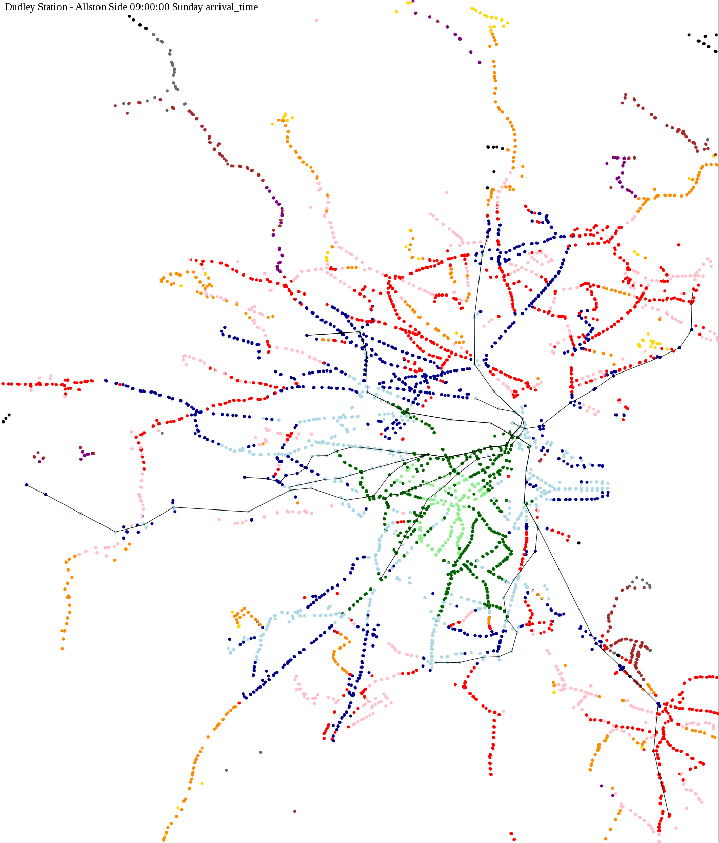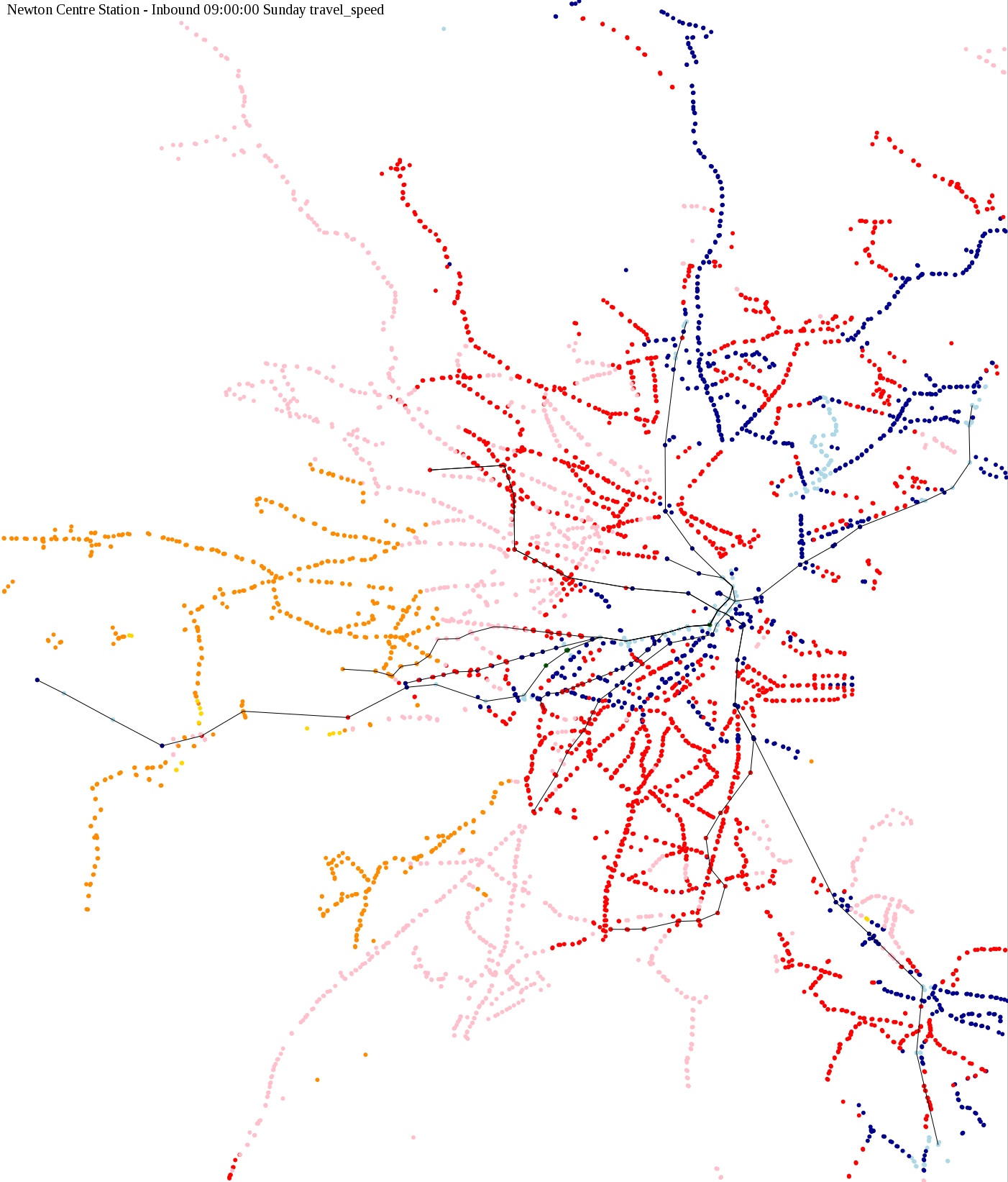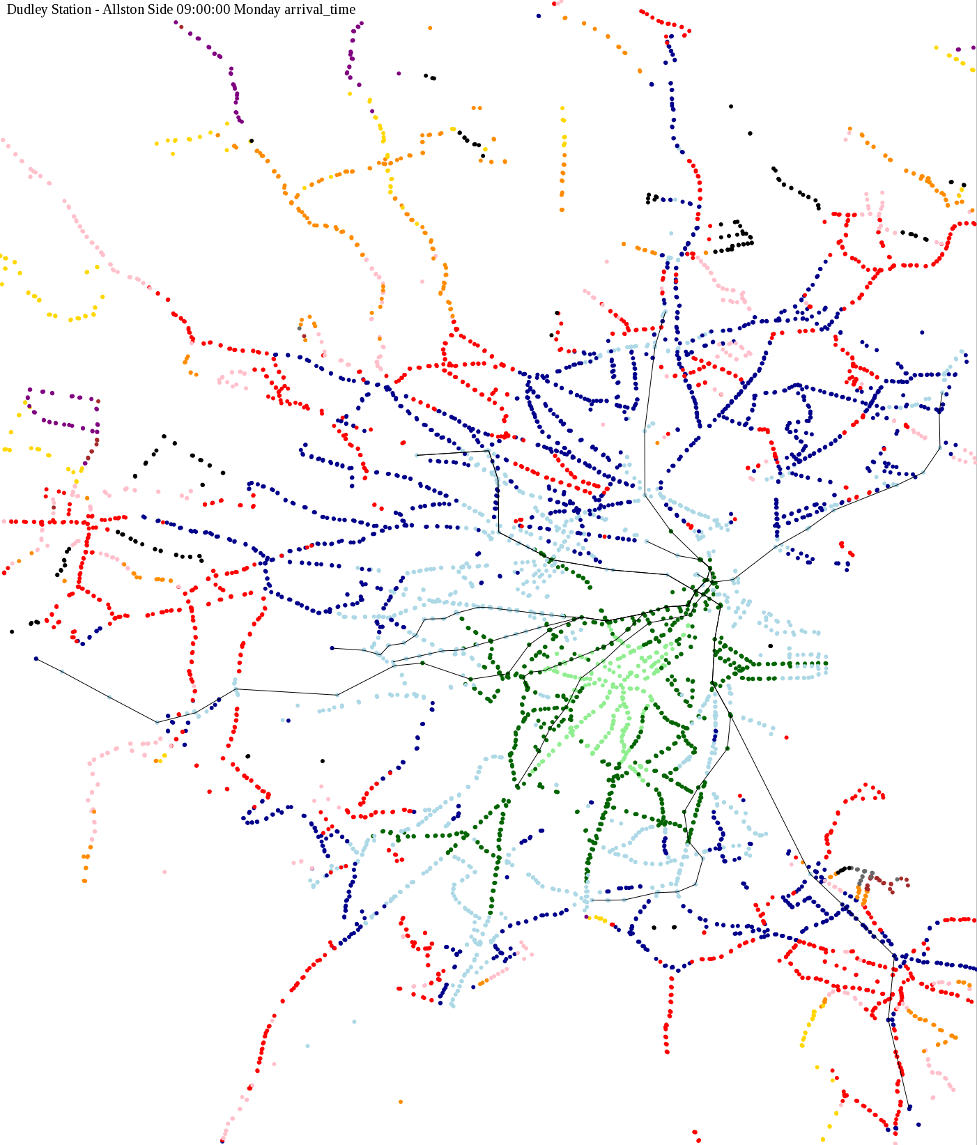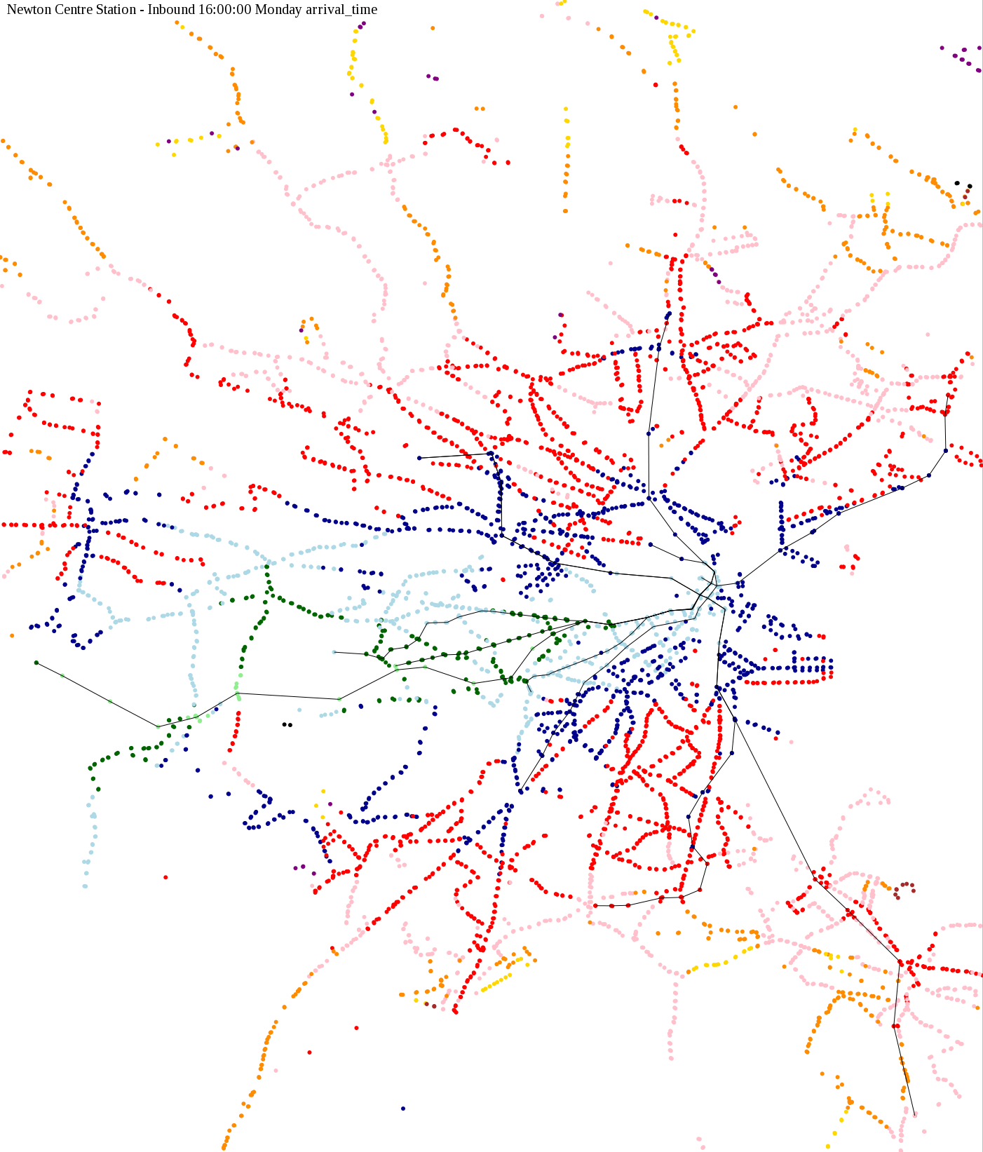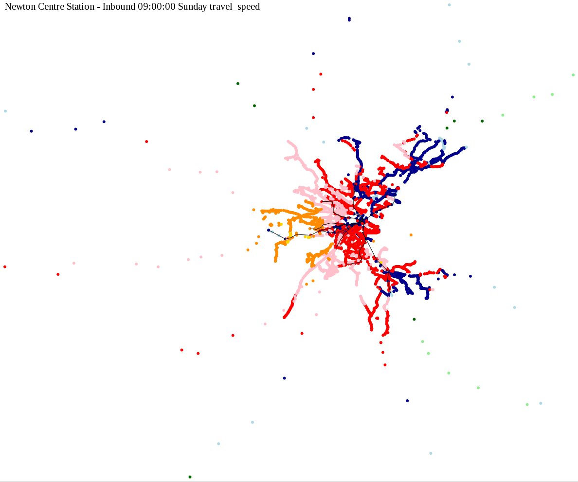 I chose a few stops out of personal curiosity to do my first few simulatations. I decided 9am Monday was a good time because it was relatively busy, and 9am Sunday was a time when relatively few services would be running. After that, I chose a set of core regional employment centers based on a MAPC Job Density map and ridership by station. In particular, the composite maps at the bottom show results averaged over my list of employment centers, approximating general connectivity to regional points of interest.