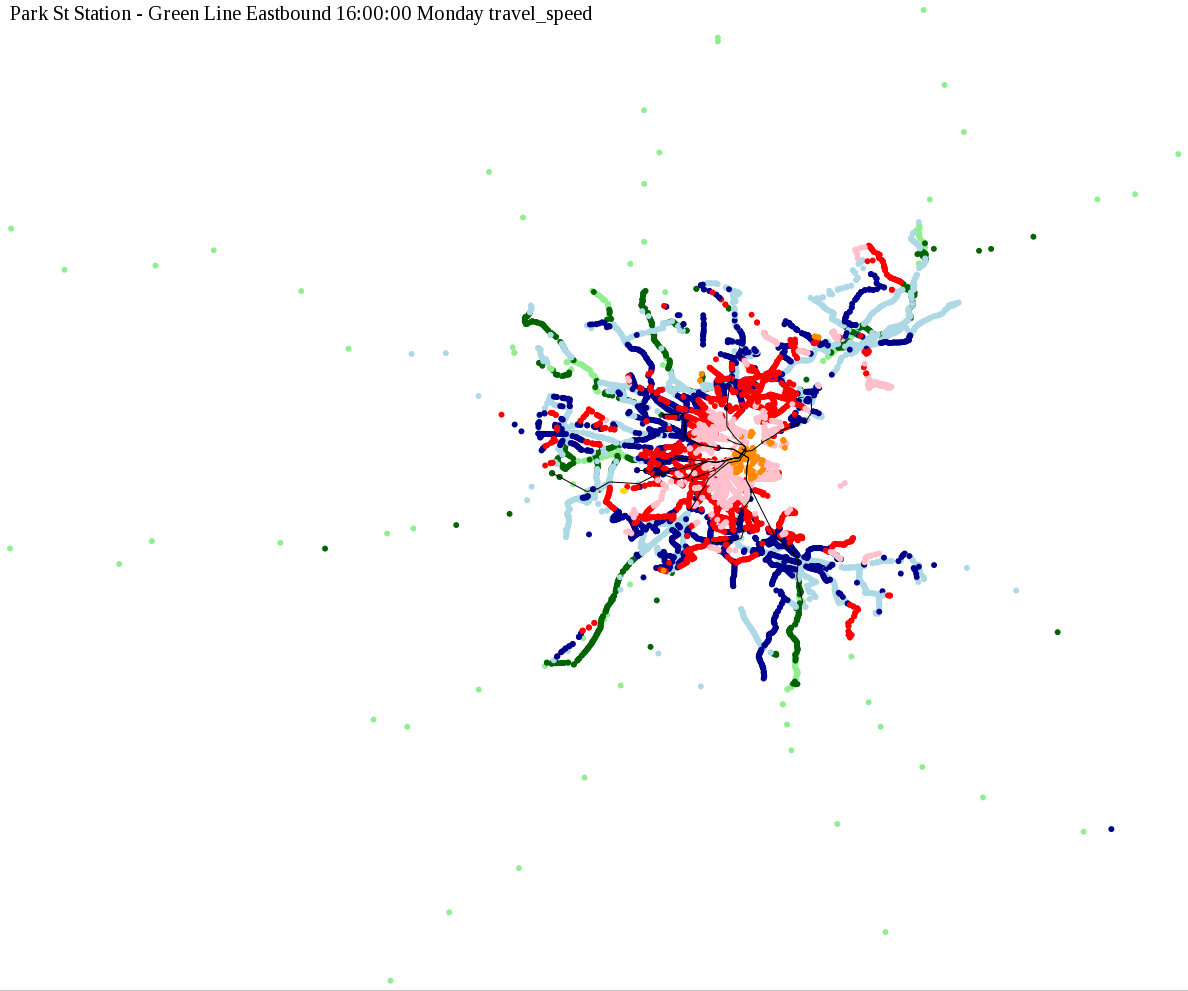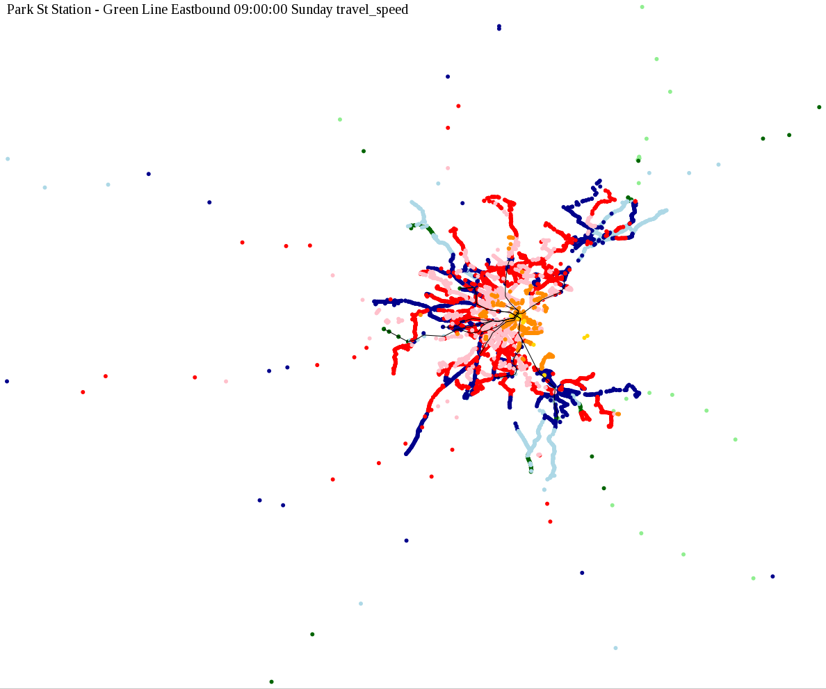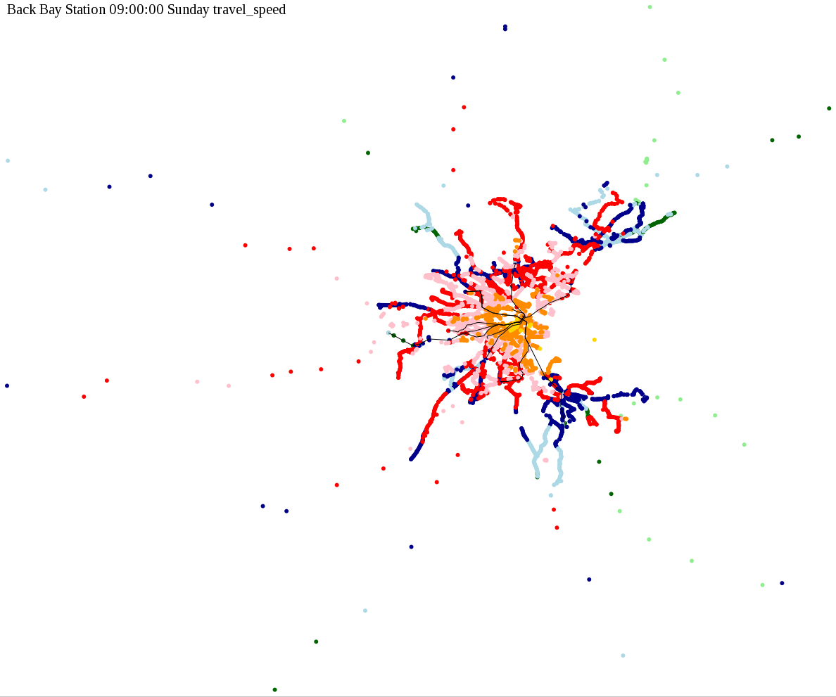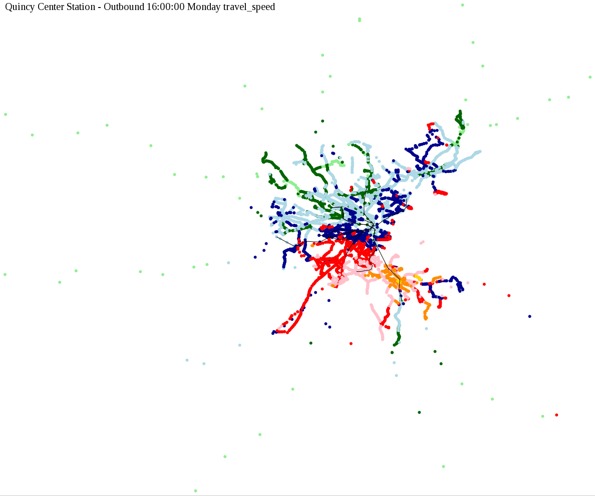 The maps below show how long it takes to get from one part of the MBTA system to another via the fastest possible route, and the average speed at which passengers travel along this route. Using the MBTA service schedules as of February, 2010, I created a simple simulation which tracks a theoretical passenger moving around the system, starting from a specific stop at a specific time. The idea for this exercise came out of the MBTA Rider Oversight Committee, which is using this visualization to find ways to improve transit service.