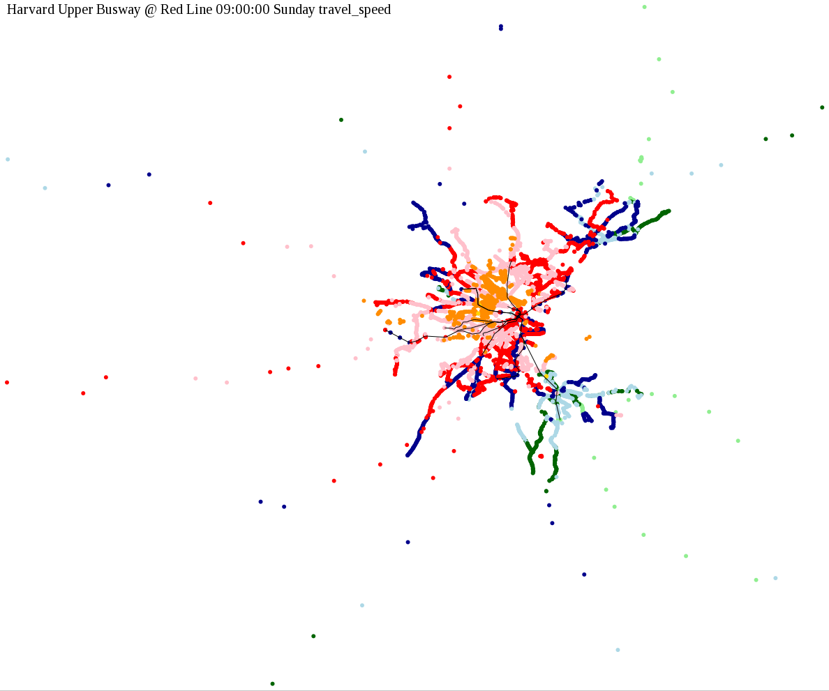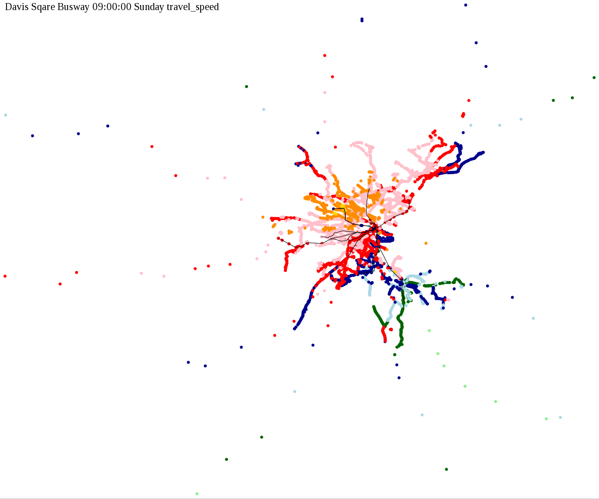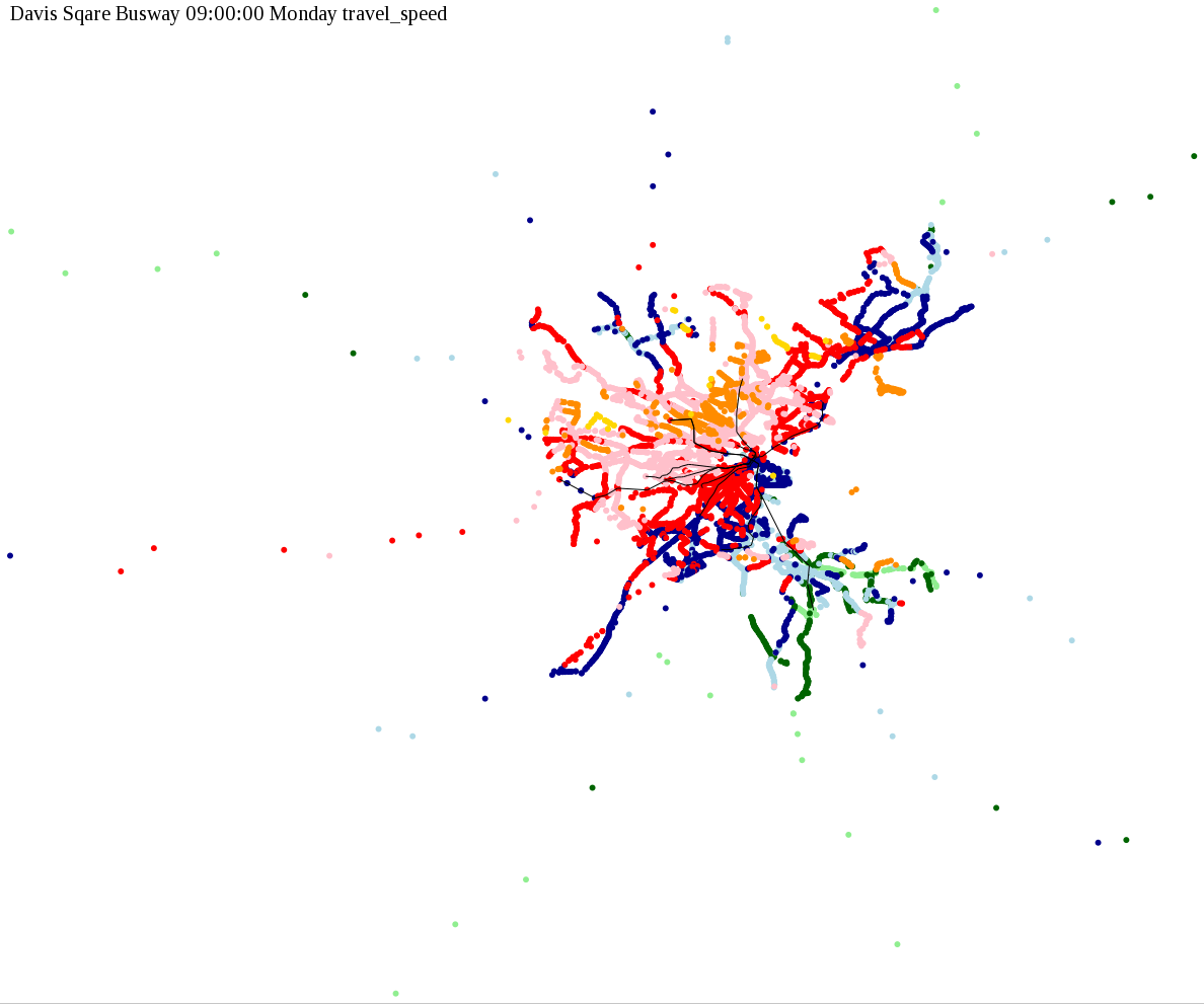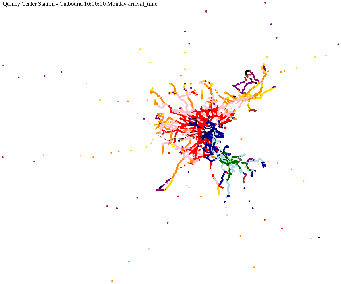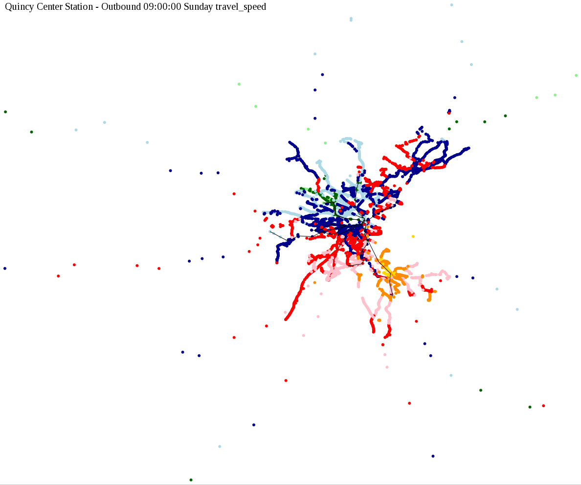 The maps below show how long it takes to get from one part of the MBTA system to another via the fastest possible route, and the average speed at which passengers travel along this route. Using the MBTA service schedules as of February, 2010, I created a simple simulation which tracks a theoretical passenger moving around the system, starting from a specific stop at a specific time. The idea for this exercise came out of the MBTA Rider Oversight Committee, which is using this visualization to find ways to improve transit service.