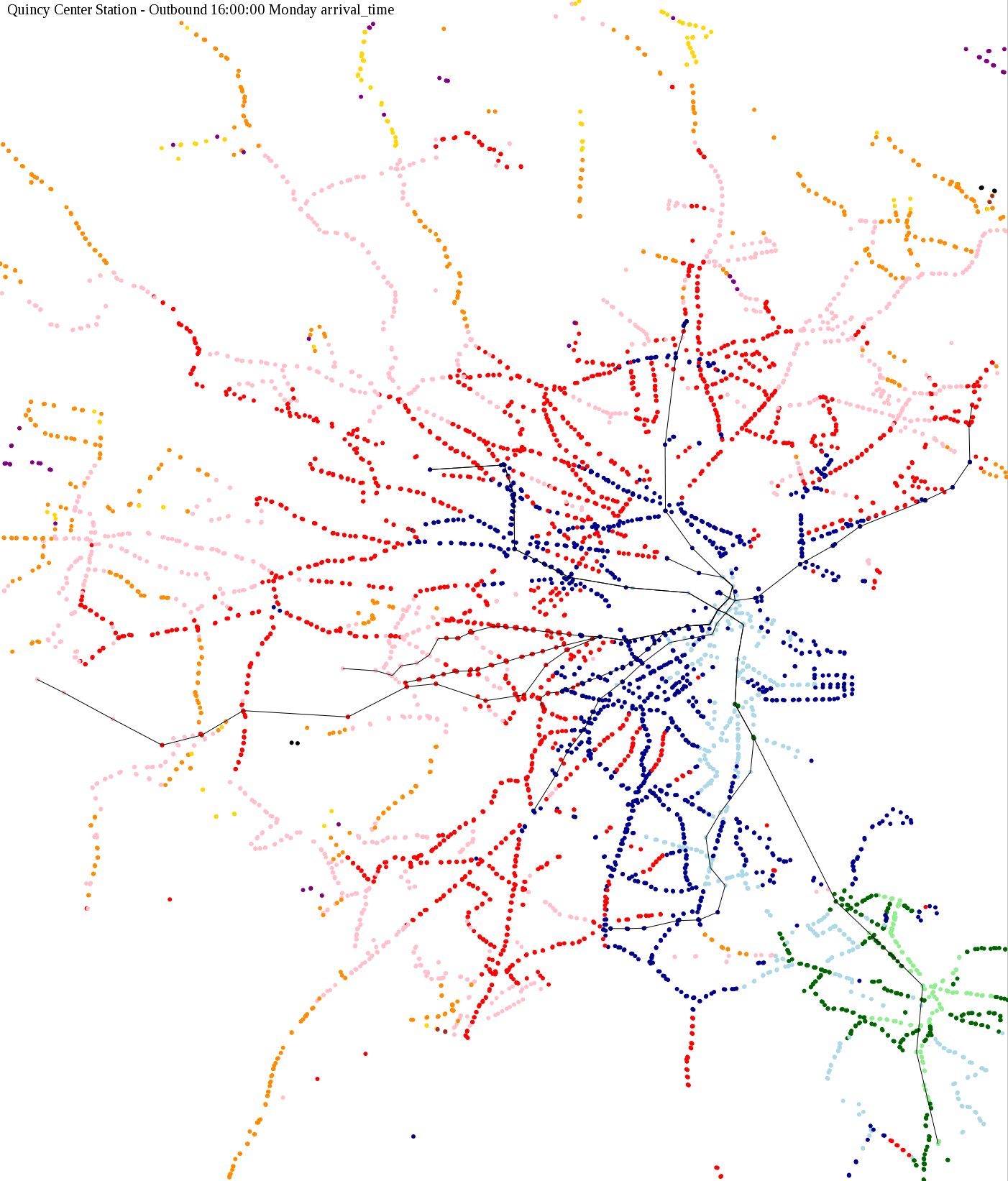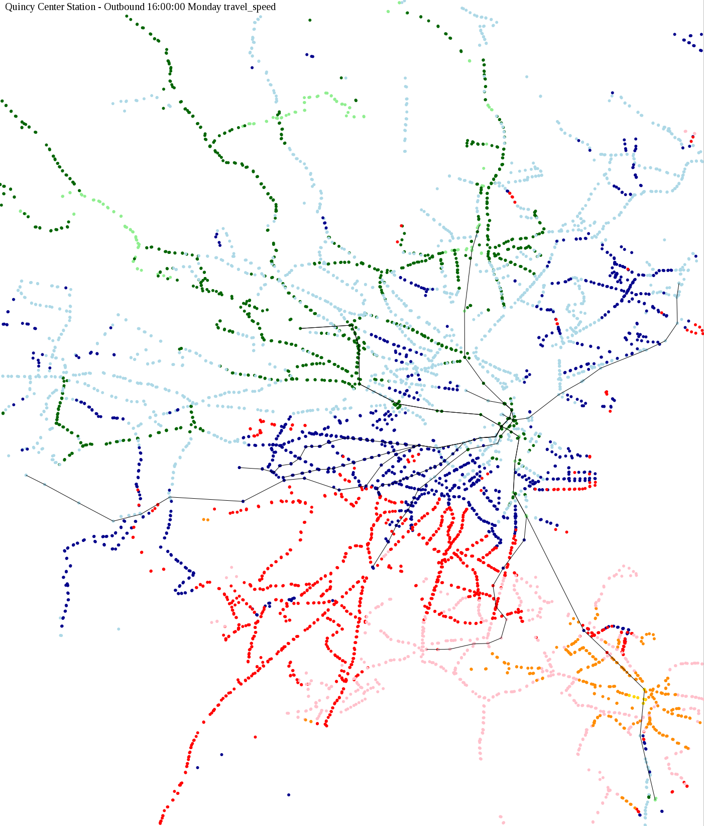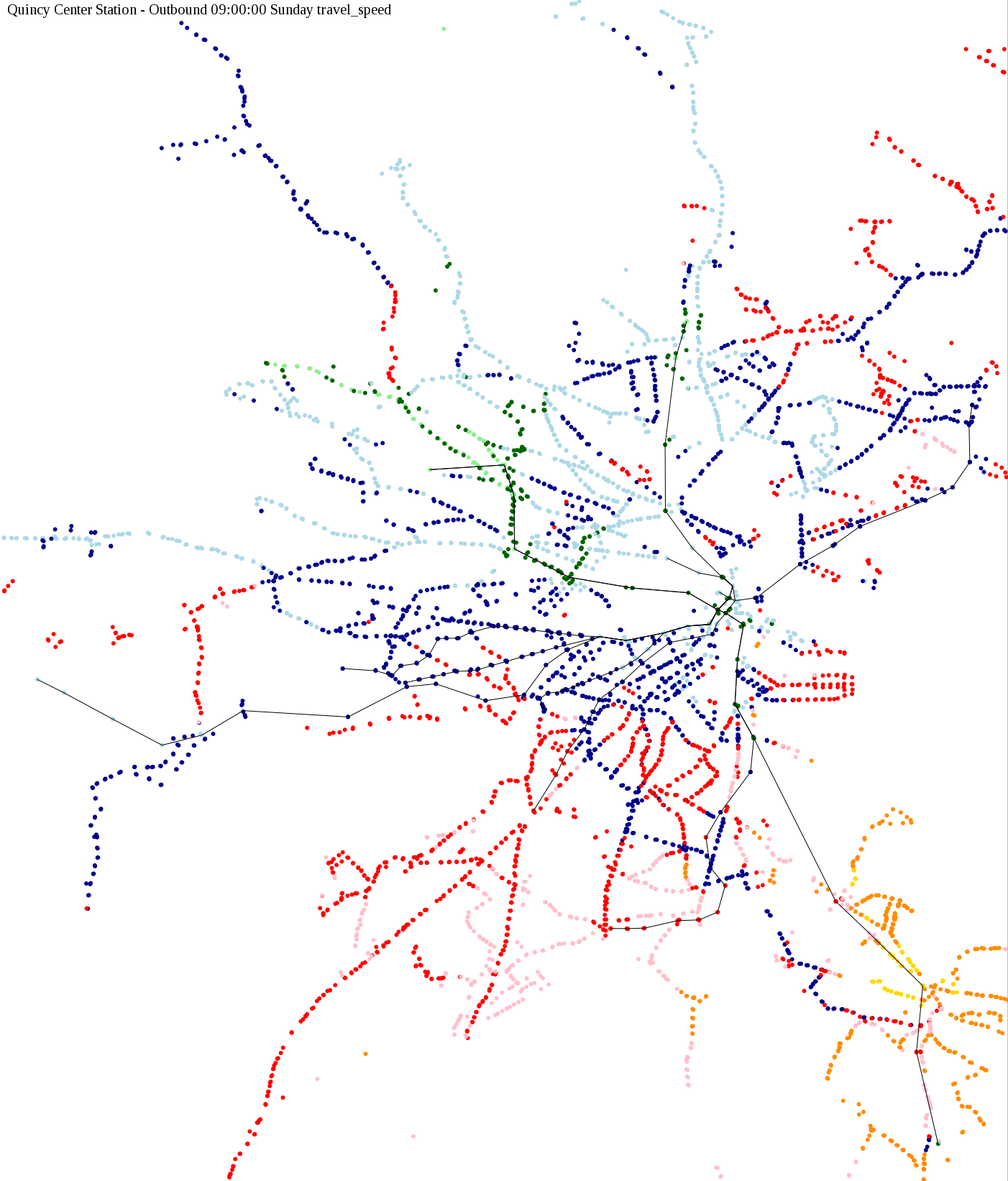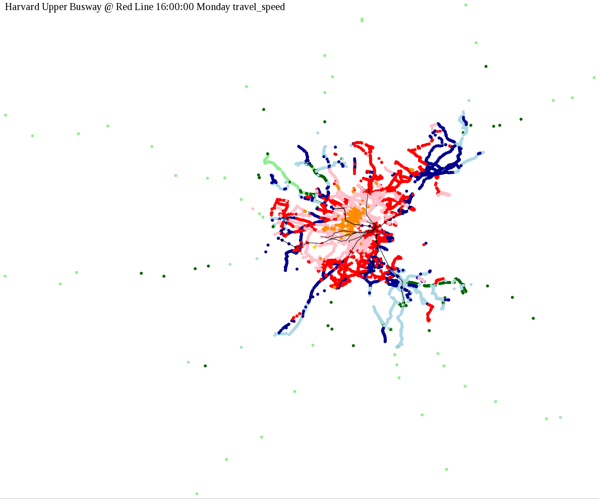 The maps below show how long it takes to get from one part of the MBTA system to another via the fastest possible route, and the average speed at which passengers travel along this route. Using the MBTA service schedules as of February, 2010, I created a simple simulation which tracks a theoretical passenger moving around the system, starting from a specific stop at a specific time. The idea for this exercise came out of the MBTA Rider Oversight Committee, which is using this visualization to find ways to improve transit service.