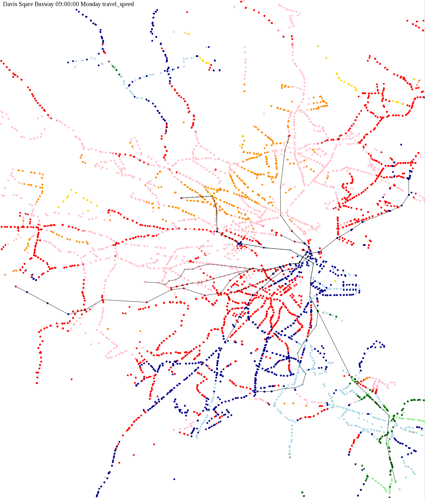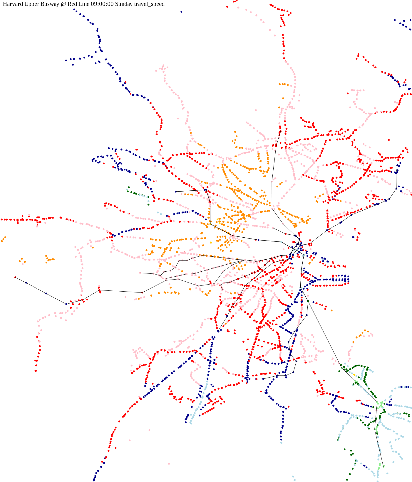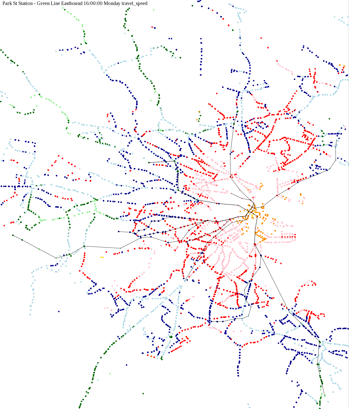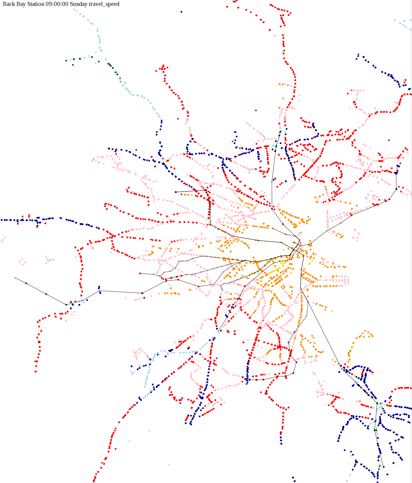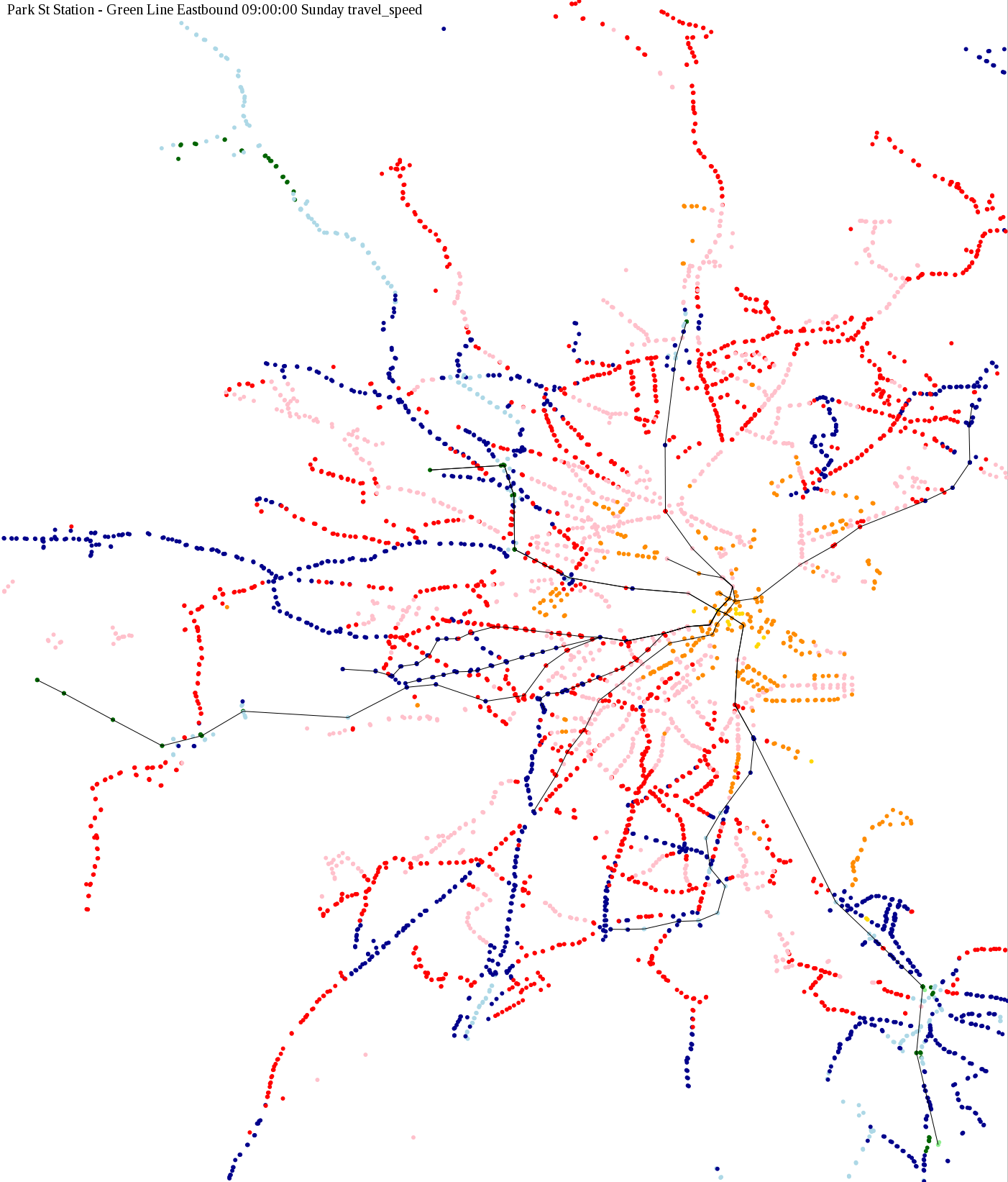 The maps below show how long it takes to get from one part of the MBTA system to another via the fastest possible route, and the average speed at which passengers travel along this route. Using the MBTA service schedules as of February, 2010, I created a simple simulation which tracks a theoretical passenger moving around the system, starting from a specific stop at a specific time. The idea for this exercise came out of the MBTA Rider Oversight Committee, which is using this visualization to find ways to improve transit service.