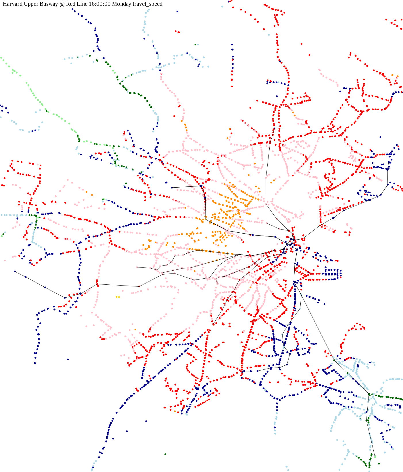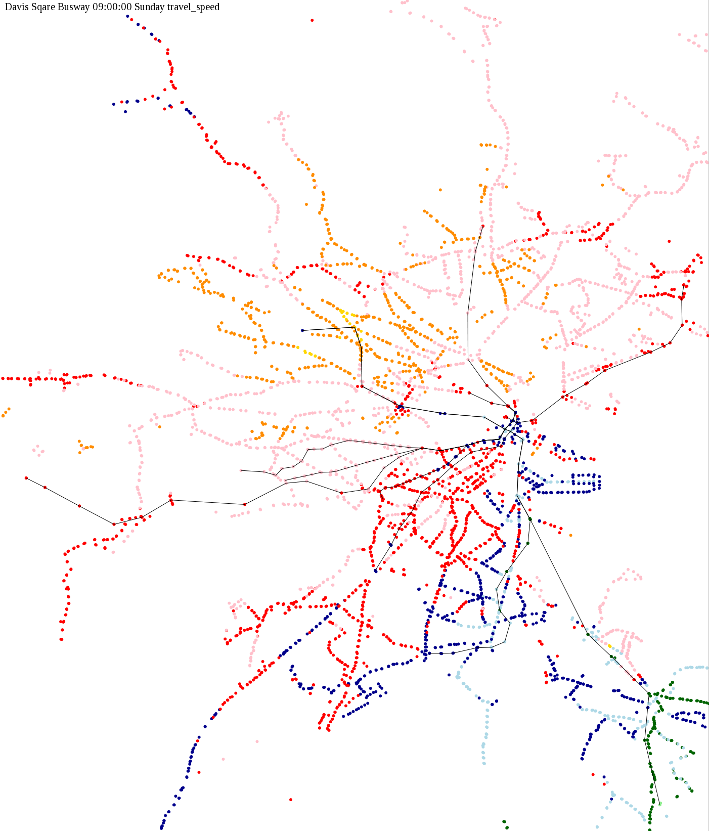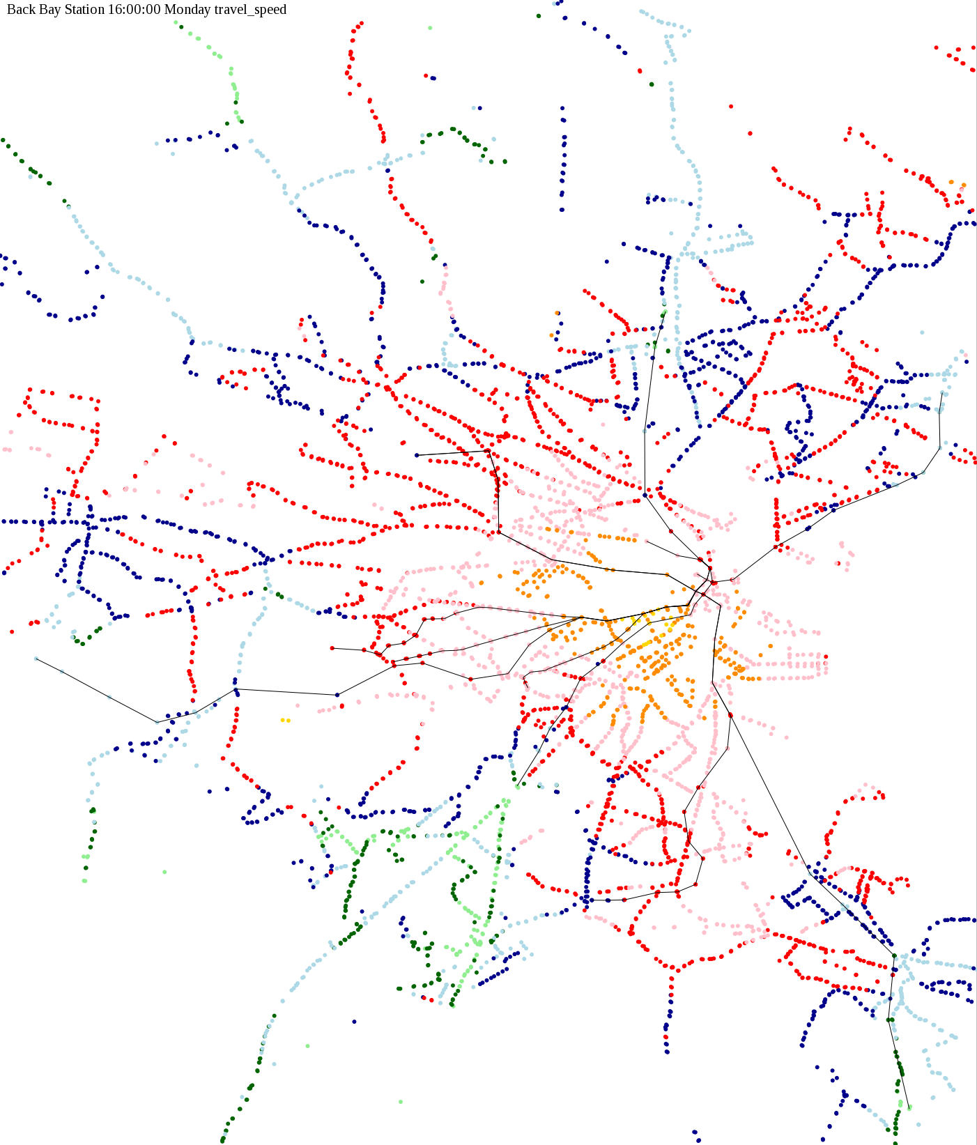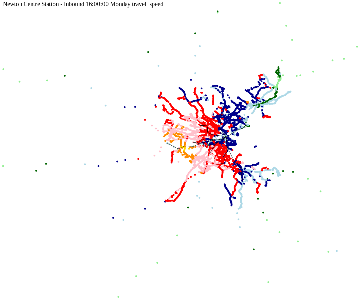 The maps below show how long it takes to get from one part of the MBTA system to another via the fastest possible route, and the average speed at which passengers travel along this route. Using the MBTA service schedules as of February, 2010, I created a simple simulation which tracks a theoretical passenger moving around the system, starting from a specific stop at a specific time. The idea for this exercise came out of the MBTA Rider Oversight Committee, which is using this visualization to find ways to improve transit service.