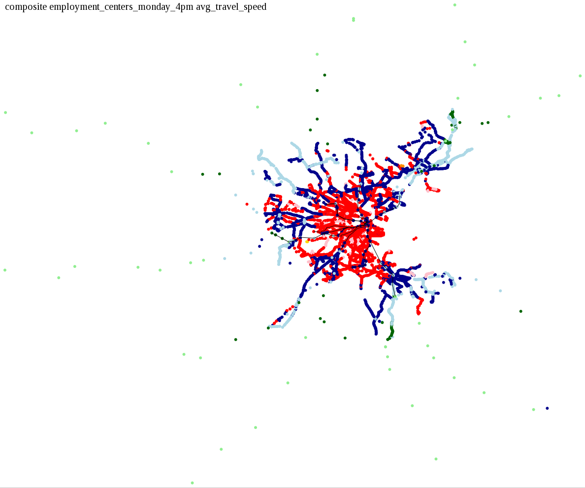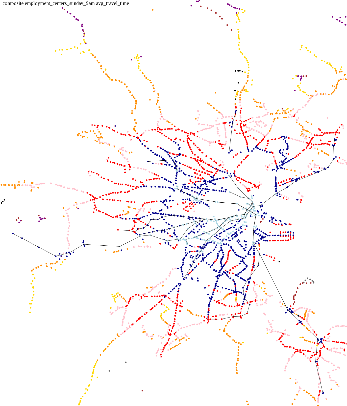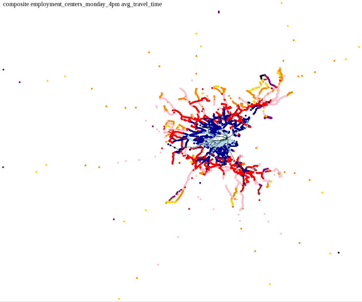 These maps show how long it takes to get from a starting point to anywhere in the system, in increments of 15 minutes. I also asked: How long does it take to get home from an employment center during the evening rush, or on Sunday morning when service is running relatively infrequently?