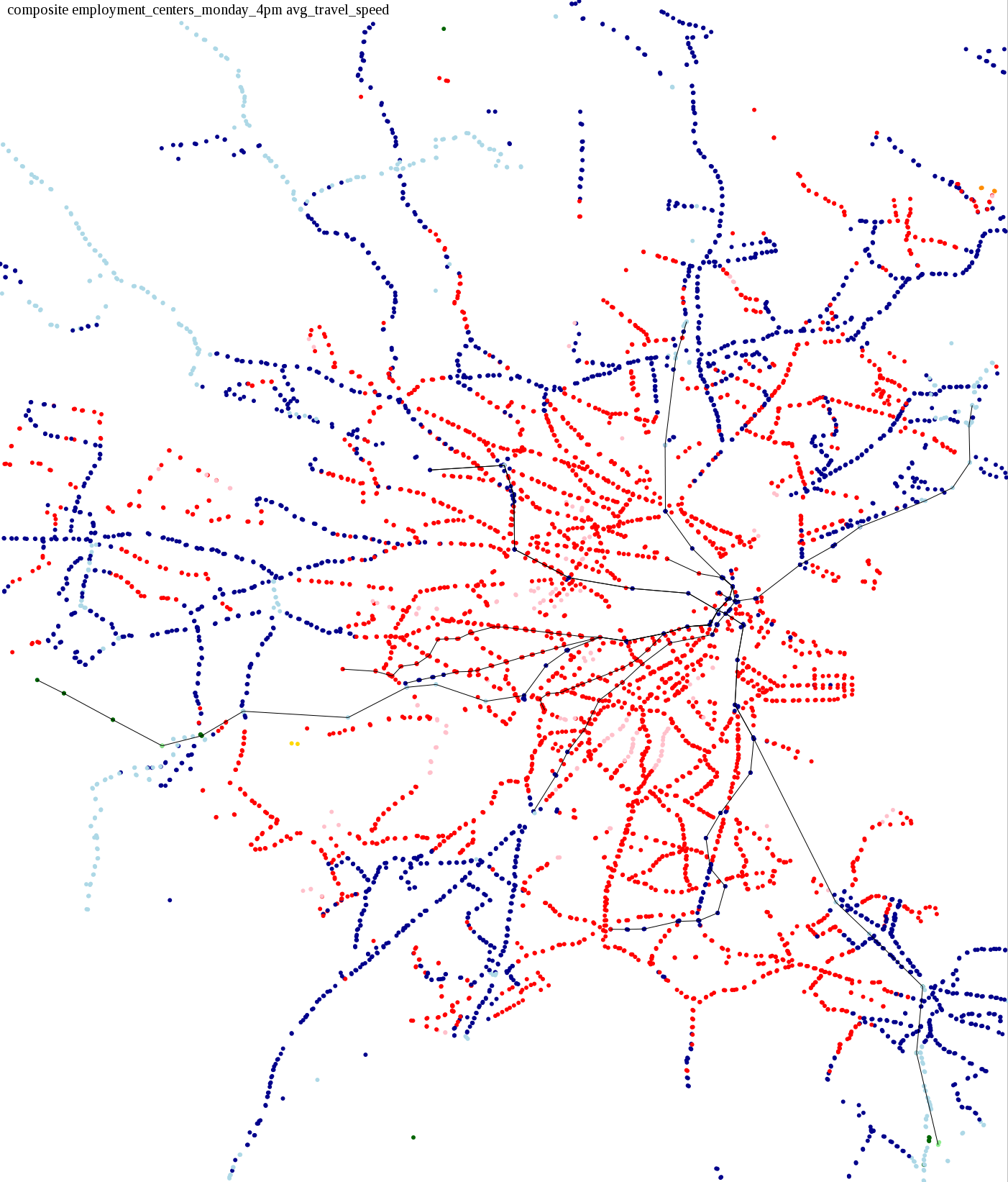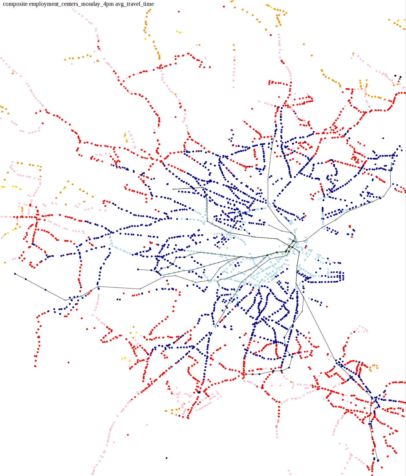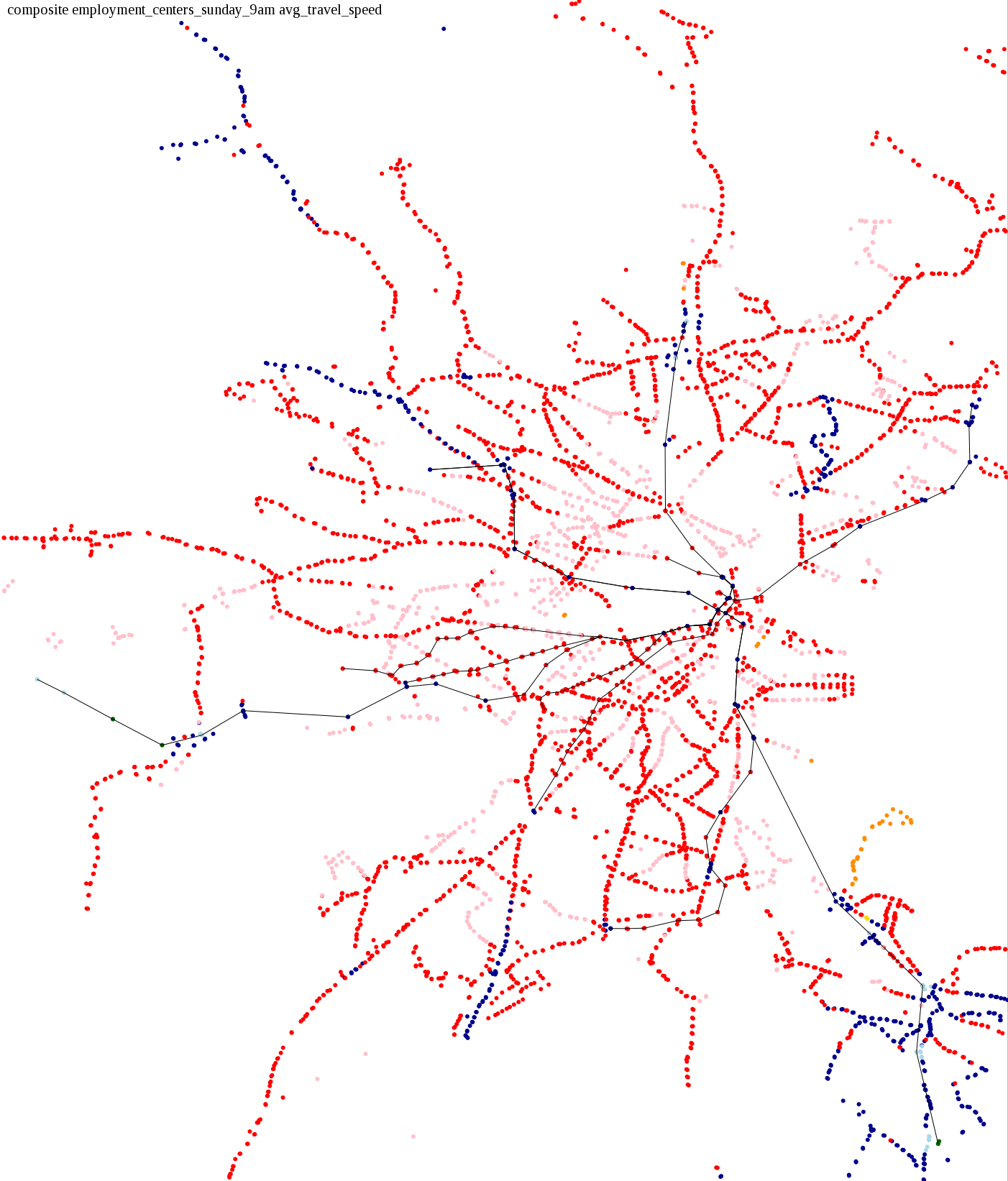 These maps show how long it takes to get from a starting point to anywhere in the system, in increments of 15 minutes. I also asked: How long does it take to get home from an employment center during the evening rush, or on Sunday morning when service is running relatively infrequently?